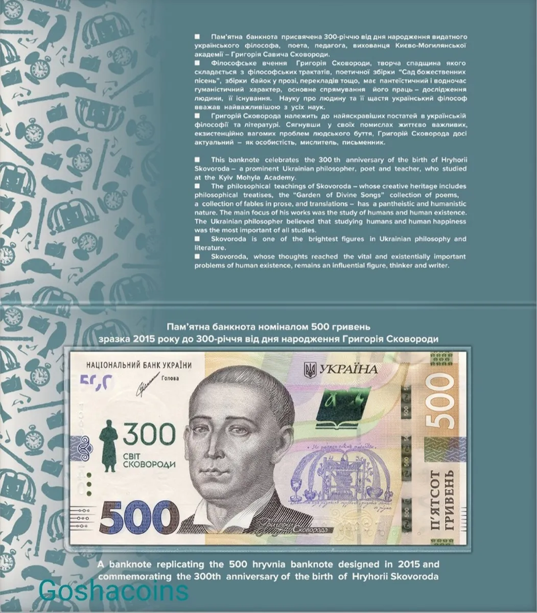 Банкнота 500 грн До 300-річчя Від дня народження Григорія Сковороди у сувенірній упаковці