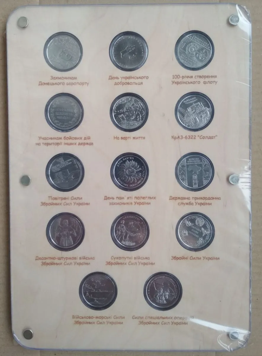 Набір монет ЗСУ 2018-2022 Збройні сили України 14 штук в планшеті.Планшет дерево з різьбою,товсте оргскло,в плівці.Ручна робота,зроблено все дуже якісно.Монети з ролу,в капсулах.10 гривень 2018 Захисникам Донецького аеропорту