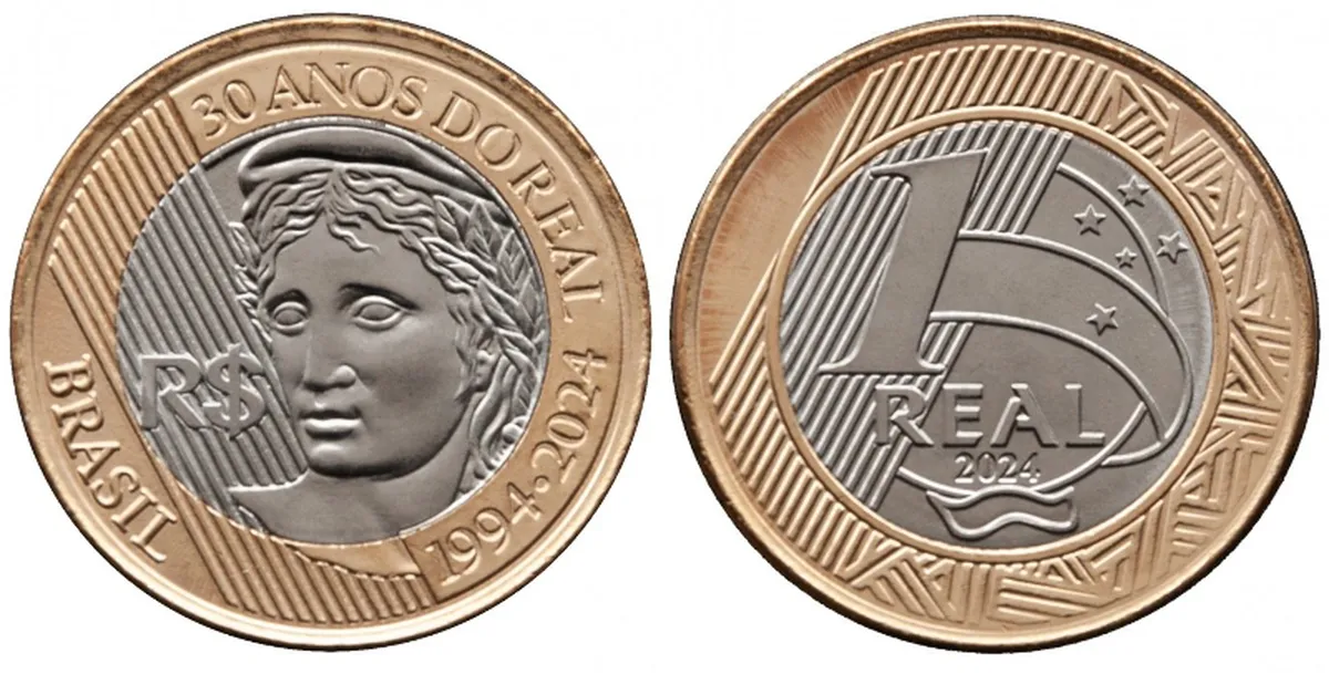 Продам ювілейну монету Бразилії 1 реал, 2024 рік "30 річниця введення реала"
