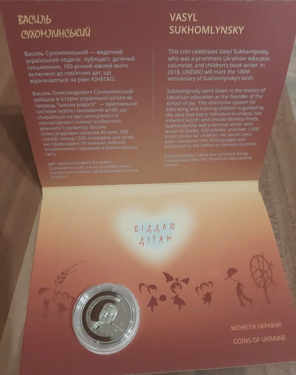 Продам памятную монету Сердце отдаю детям (к 100-летию со дня рождения В. А. Сухомлинского ) в сув. упаковке, 2018 г.