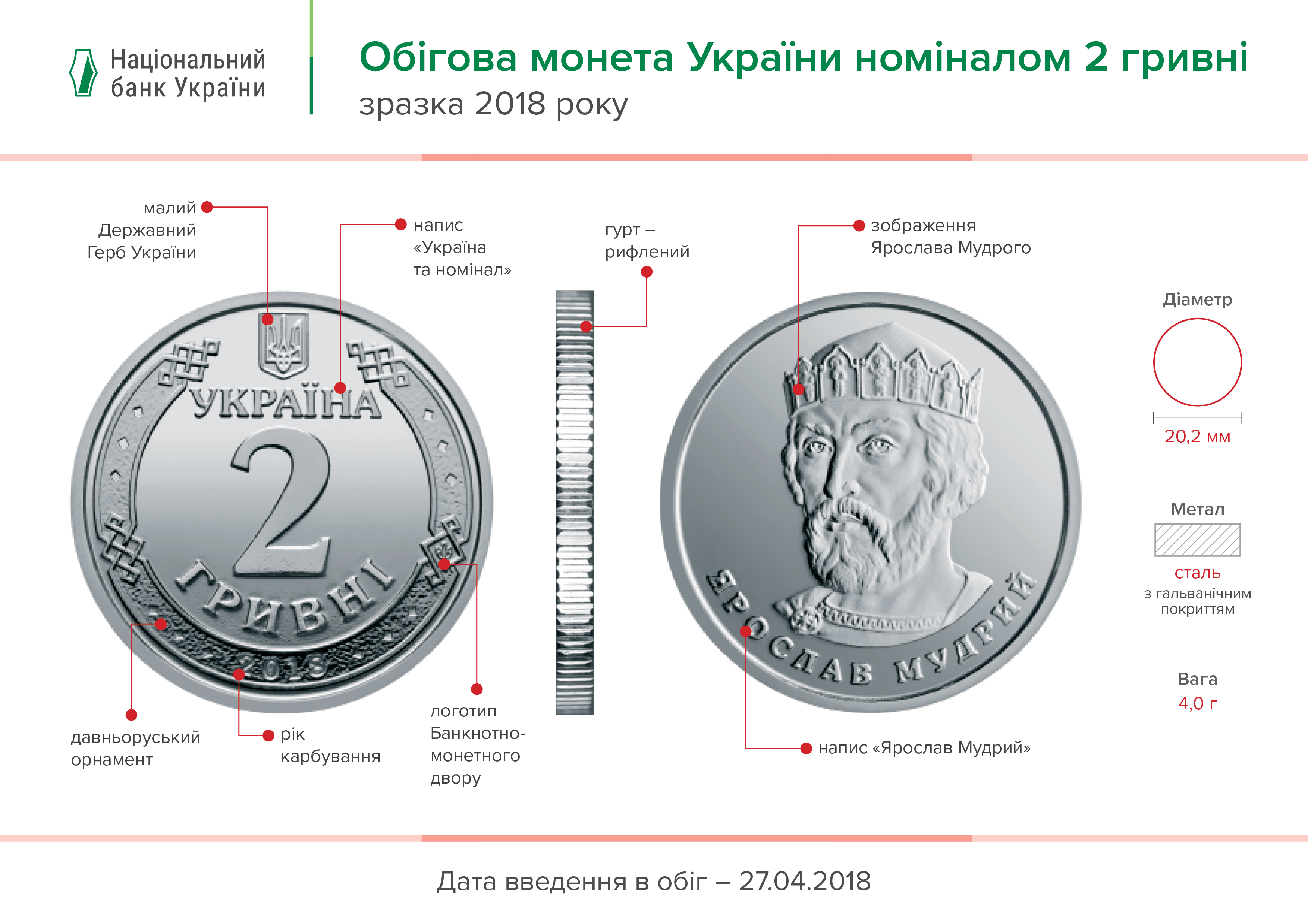 В соответствии с политикой оптимизации наличного обращения Украины Национальный банк Украины принял решение поэтапно вводить в оборот новые оборотные монеты - 1, 2, 5 и 10 гривен. С 27 апреля 2018 начался первый этап - введено в обращение монеты номинальной стоимостью 1 и 2 гривны. Второй этап состоится позже, монеты номинальной стоимостью 5 и 10 гривны вводиться в обращение в 2019 - 2020 годах (точную дату Национальный банк сообщит дополнительно).