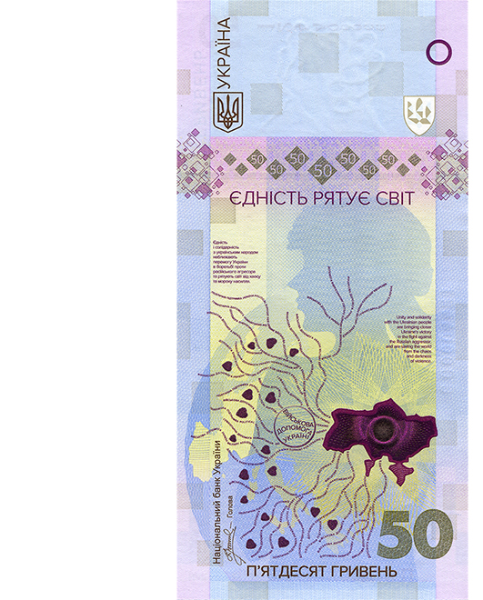 Commemorative banknote "unity saves the world", dedicated to the invincibility of the Ukrainian people in the struggle for freedom and European values, the consolidation of Ukrainian society to protect territorial integrity, as well as the unity of the democratic world in the face of Russian aggression. Commemorative banknote with a face value of 50 hryvnias issued in 2024 with the signature of the chairman of the National Bank of Ukraine Andriy Pyshny of the EU series with the numbers 0000001-0300000; contains elements of protection of the current nominal series of banknotes and additional optically replaceable protection elements; circulation-300,000 PCs. [of which: 299,952 PCs. - in a souvenir package, two uncut sheets (24 banknotes on one sheet)]. On the front side of the commemorative banknote in the central part there is an artistic and figurative composition that reflects the stylized outline of Ukraine, which is associated with the heart to which the vessels fit. The background image is an image of a girl in a military helmet looking towards the Sunset. In the lower part of the commemorative banknote, against the background of the globe, there is a stylized image of Europe, from the countries of which vessels seem to depart-routes of assistance and support to Ukraine. Stylized hearts placed between the vessels-routes symbolize sacrifice and compassion. In the upper part of the commemorative banknote, a watermark is placed in the center. To the right of the watermark field is a through element – a stylized Chevron of the Armed Forces of Ukraine and a special relief element in the form of a circle for visually impaired people. To the left of the watermark field is the inscription Ukraine and the image of the small state coat of arms of Ukraine. Under the watermark field on both sides there is a stylized composition of filled and contour squares (central squares – with the designation of the face value of the commemorative banknote), a semi-transparent strip filled with the outline of the logo of the National Bank of Ukraine. Under the Strip in the center of the commemorative banknote is placed the inscription unity saves the world and two text blocks (left and right) in Ukrainian and English: unity / and solidarity / with the Ukrainian people / bring closer / the victory of Ukraine / in the fight against / the Russian aggressor / and save the world from chaos / and the darkness of violence.; UNITY AND SOLIDARITY / WITH THE UKRAINIAN PEOPLE / ARE BRINGING CLOSER / UKRAINE’S VICTORY / IN THE FIGHT AGAINST / THE RUSSIAN AGGRESSOR, / AND ARE SAVING THE WORLD / FROM THE CHAOS / AND DARKNESS / OF VIOLENCE.; vertical inscription National Bank of Ukraine, signature of the chairman of the National Bank of Ukraine and the word Chairman – in the lower left part; inscription fifty hryvnia – in the central lower part. The digital denomination designation is placed horizontally in the lower right part of the commemorative banknote. The design of the front side of the banknote is complemented by other elements made with multi-color printing. The main image of the reverse side of the commemorative banknote is a symbolic composition of clenched hands, symbolizing cooperation, mutual assistance, trust and partnership against the background of a stylized Trident – a symbol of the Ukrainian state. In the upper part of the commemorative banknote there is a stylized image of the digital denomination designation formed by a protective grid. The inscription fifty / Hryvnia is located vertically in the upper right part of the banknote and horizontally in the central lower part. The digital designation of the denomination 50 is placed horizontally in the upper right part of the banknote and vertically (together with the graphic designation of the hryvnia) in the lower left part of the commemorative banknote. In the upper part in the center of the commemorative banknote is the inscription unity – power! At the bottom of the commemorative banknote is the year of its issue 2024. the serial number is printed twice. A horizontal number in the direction of reading (with a variable height of digits) is applied along the upper edge of the commemorative banknote with red paint, while a vertical number is applied along the left edge of the commemorative banknote with black paint. The design of the reverse side of the banknote is complemented by other elements made with multi-color printing.