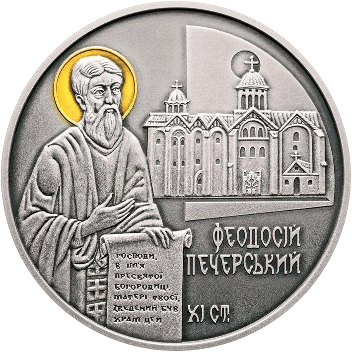 The coin is dedicated to one of the founders and hegumens of Kyiv Pechersk Monastery, Theodosius of the Caves (year of birth unknown - 1074). Kyiv Pechersk Monastery flourished during his rule - it teemed with people, boasted many churches, and adopted the Studite statute of monastic rules.