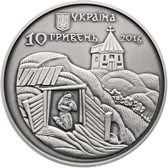 Obverse: above there is the Small Coat of Arms of Ukraine with the inscription УКРАЇНА/10 ГРИВЕНЬ 2016 (Ukraine/10 hryvnias 2016); there is the conventionalized image of Kyiv hills, a small chapel, and in the foreground there are caves with a monk kneeling in a praying position.