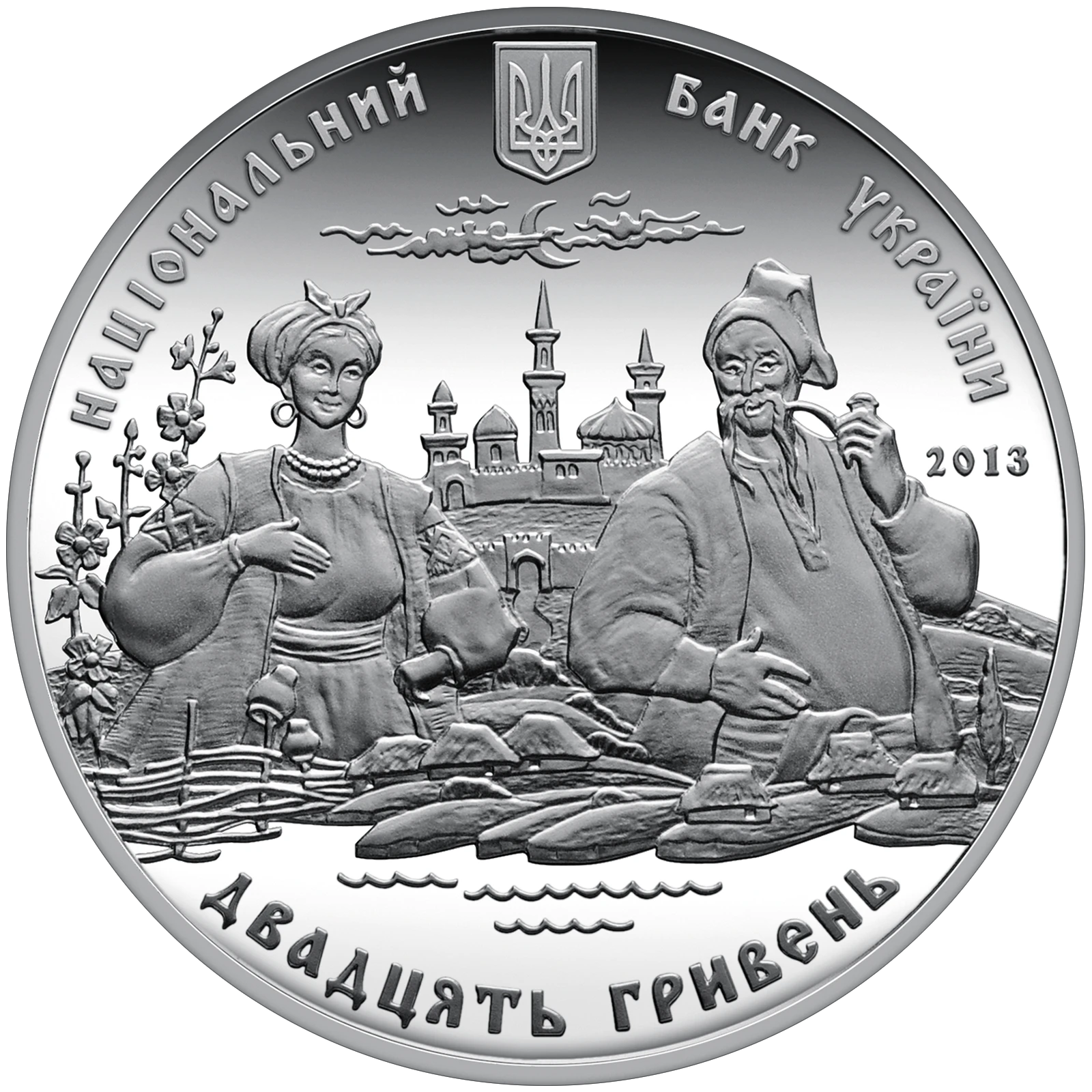 Obverse: above there is the Small Coat of Arms of Ukraine with the semicircular legend НАЦІОНАЛЬНИЙ БАНК УКРАЇНИ (National Bank of Ukraine); in the centre there is the conventionalized composition depicting Odarka and Ivan Karas, the opera central figures, against the background of the mosque image; in the foreground there is a rural view - thatched cabins, fence, mallows; the legends - 2013 to the right, ДВАДЦЯТЬ ГРИВЕНЬ (twenty hryvnias) semicircular below.