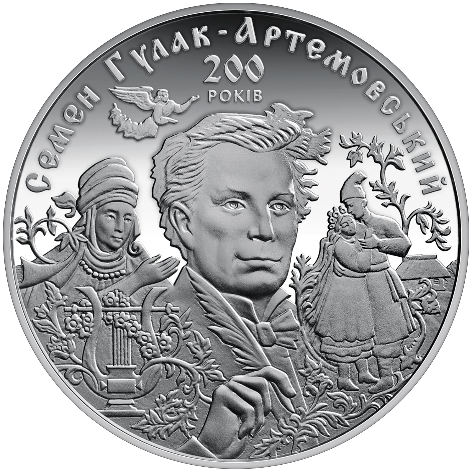 The coin is dedicated to the bicentenary of birth of Semen Hulak-Artemovsky, a Ukrainian composer, opera artist, brilliant actor, the author of the first Ukrainian opera `Zaporozhets za Dunaiem` (A Zaporozhian (Cossack) beyond the Danube, meaning in exile) belonging to the golden pool of the national musical heritage as well as to the 150th anniversary of the first performance of the opera. It is an outstanding accomplishment of the composer incarnating the national peculiarities of the Ukrainian folklore and everyday life of the epoch. Semen Stepanovych Hulak-Artemovsky was as well the author of the opera word book and the first performer of the role of Karas.