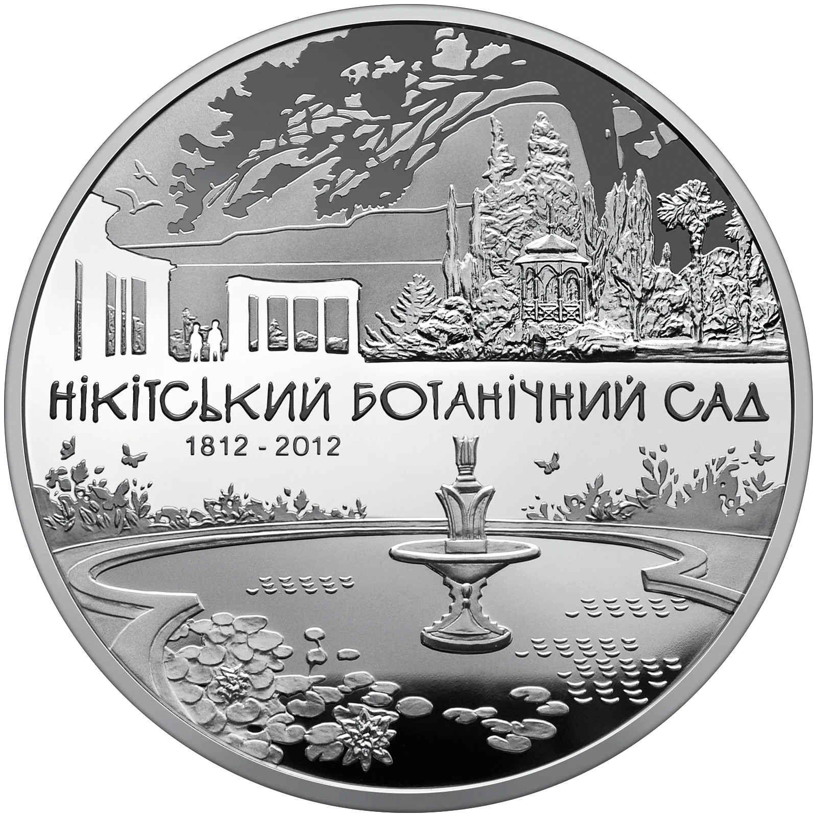 On the reverse of the coin there are depicted: a pond with a fountain in the middle; against the background of waterscape, in the middle distance, a garden part with a pavilion; against the background of the pond below - the legend НІКІТСЬКИЙ / БОТАНІЧНИЙ САД / 1812-2012 (Nikitsky / Botanical Garden / 1812-2012).