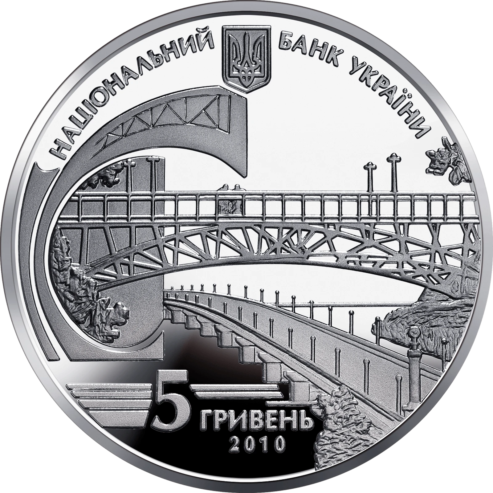 On the coin obverse above there is the Small Coat of Arms of Ukraine with the semicircular legend НАЦІОНАЛЬНИЙ БАНК УКРАЇНИ (National Bank of Ukraine); below there is the composition symbolizing the scholar`s activity in the bridge engineering which represents the Paton Bridge, the first fully welded bridge in Europe, the footbridge over Petrovska Alley and conventionalized Whatman`s paper sheet (to the left); beneath there is the inscription 5 ГРИВЕНЬ/2010 (5 hryvnias).
