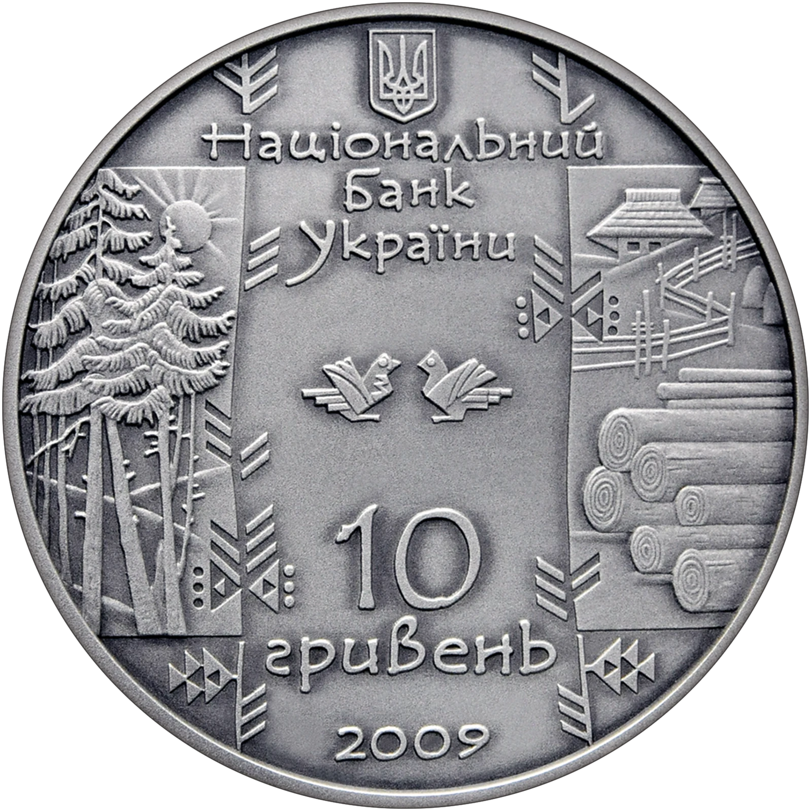 On the obverse of the coin there are depicted the Small Coat of Arms of Ukraine (above) with the conventionalized inscription НАЦІОНАЛЬНИЙ БАНК УКРАЇНИ (National Bank of Ukraine) thereunder, conventionalized images of two birds in the centre and Carpathian landscapes to the left and to the right with spruces, cottages and logs; below there are the legends: on the silver coin 10/ГРИВЕНЬ/2009 (10 hryvnias).