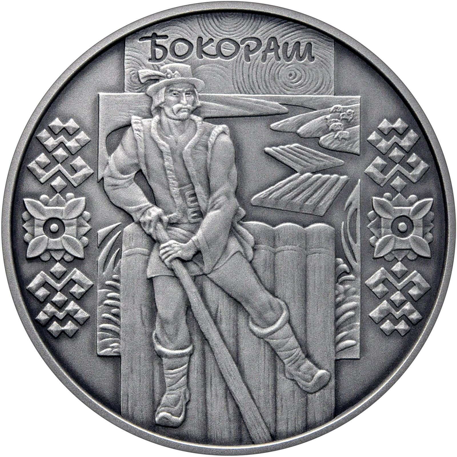 On the reverse of the coin there is depicted the figure of a bokorash with a tsapyna (pole) in the hands which is directing the raft downstream, on either side of him there are traditional Carpathian ornamental patterns; above, against the background in the form of a log butt end there is the legend БОКОРАШ (Bokorash).