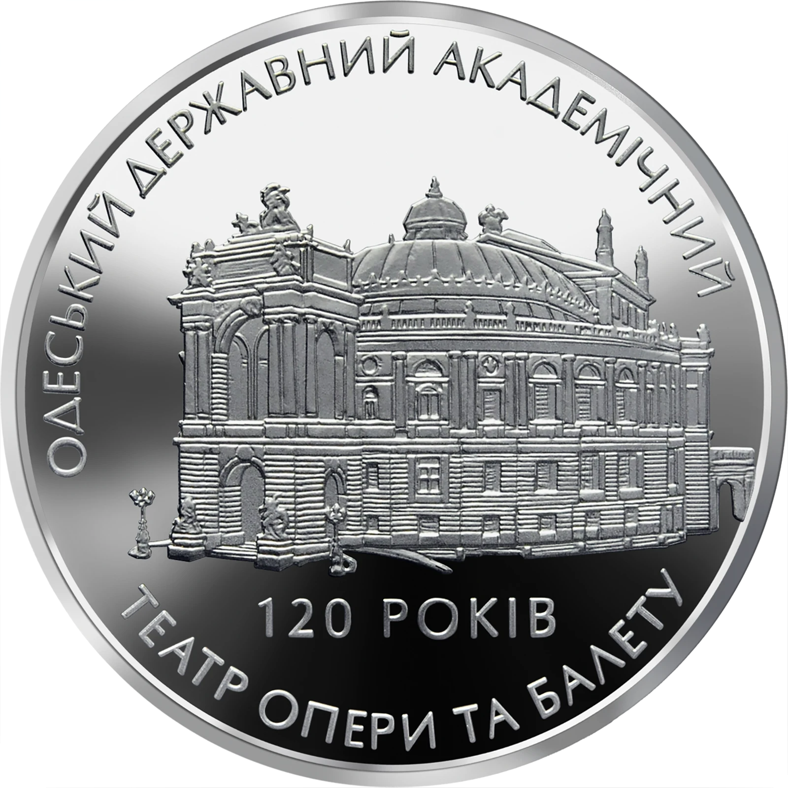 On the reverse of both coins the building of the Odesa State Academic Opera and Ballet Theatre is depicted, under which there is the inscription: 120 РОКІВ (120 Years), and one more around the coin circumference - ОДЕСЬКИЙ ДЕРЖАВНИЙ АКАДЕМІЧНИЙ ТЕАТ ОПЕРИ ТА БАЛЕТУ (Odesa State Academic Opera and Ballet Theatre).