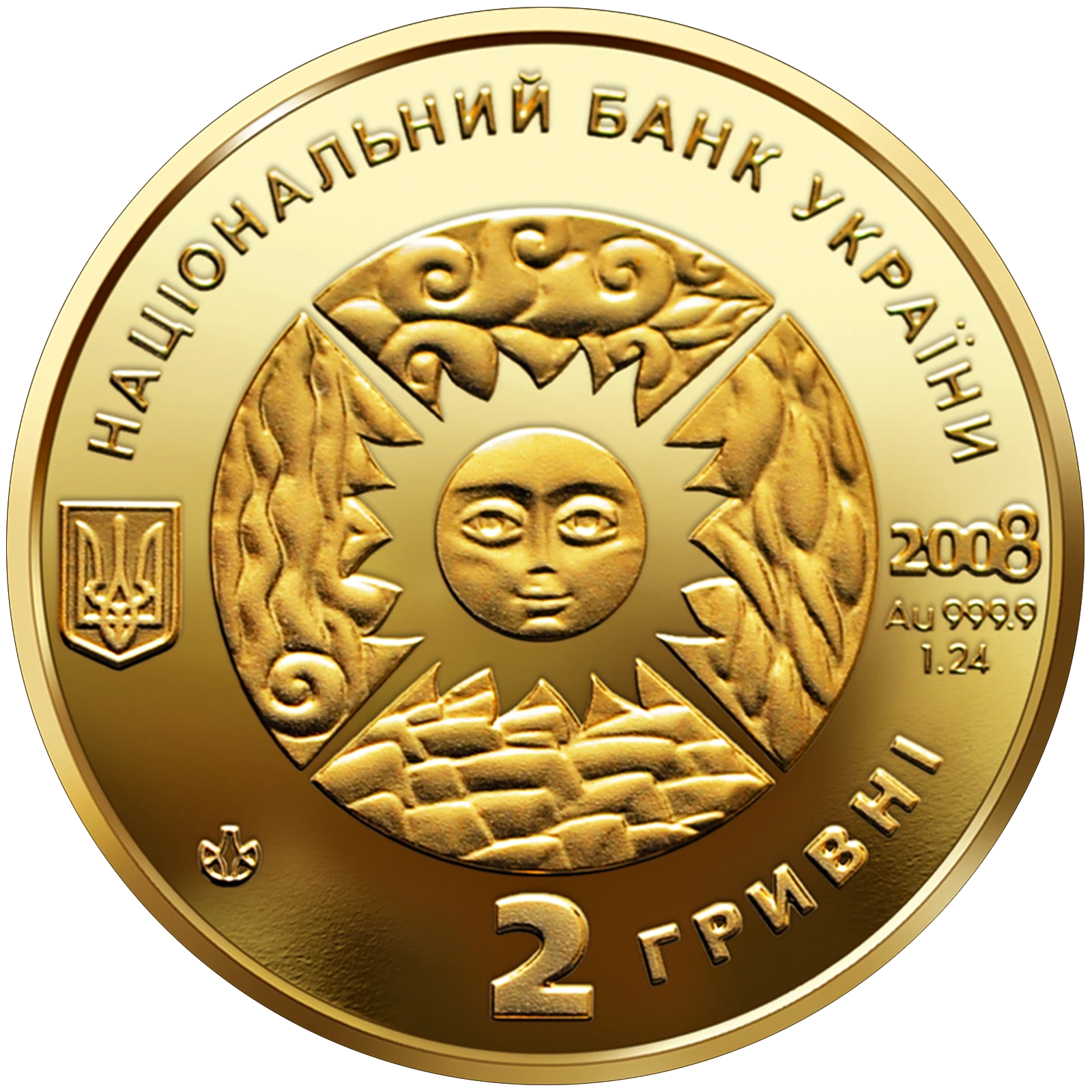 On the coin obverse of the 2 hryvnia coin there is a circle diagonally divided into sectors symbolizing four elements: earth, air, water, fire; in the center of the circle there is a conventionalized image of the Sun. To the left of the circle there is the Small National Emblem of Ukraine, to the right – the year of issue: 2008 as well as the indication of the metal, its fineness – Au 999.9, weight of the precious metal in fineness – 1.24; there are the circumferential legends: Національний Банк України (National Bank of Ukraine) above, 2 Гривні (2 hryvnias) below and the logotype of the National Bank of Ukraine Mint.