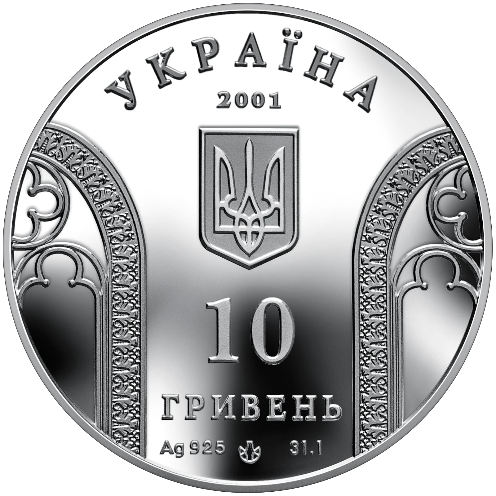 There are no ads yet. Put up for saleOn the coin obverse between two ornamental slits there are depicted the small National Emblem of Ukraine and the inscriptions: on the silver coin: УКРАЇНА, 2001, 10, ГРИВЕНЬ (Ukraine/ 10 Hryvnia 2001), as well as the designation of the metal, its fineness and its weight in fineness. There is also the depiction of the logotype of the Mint of the National Bank of Ukraine.