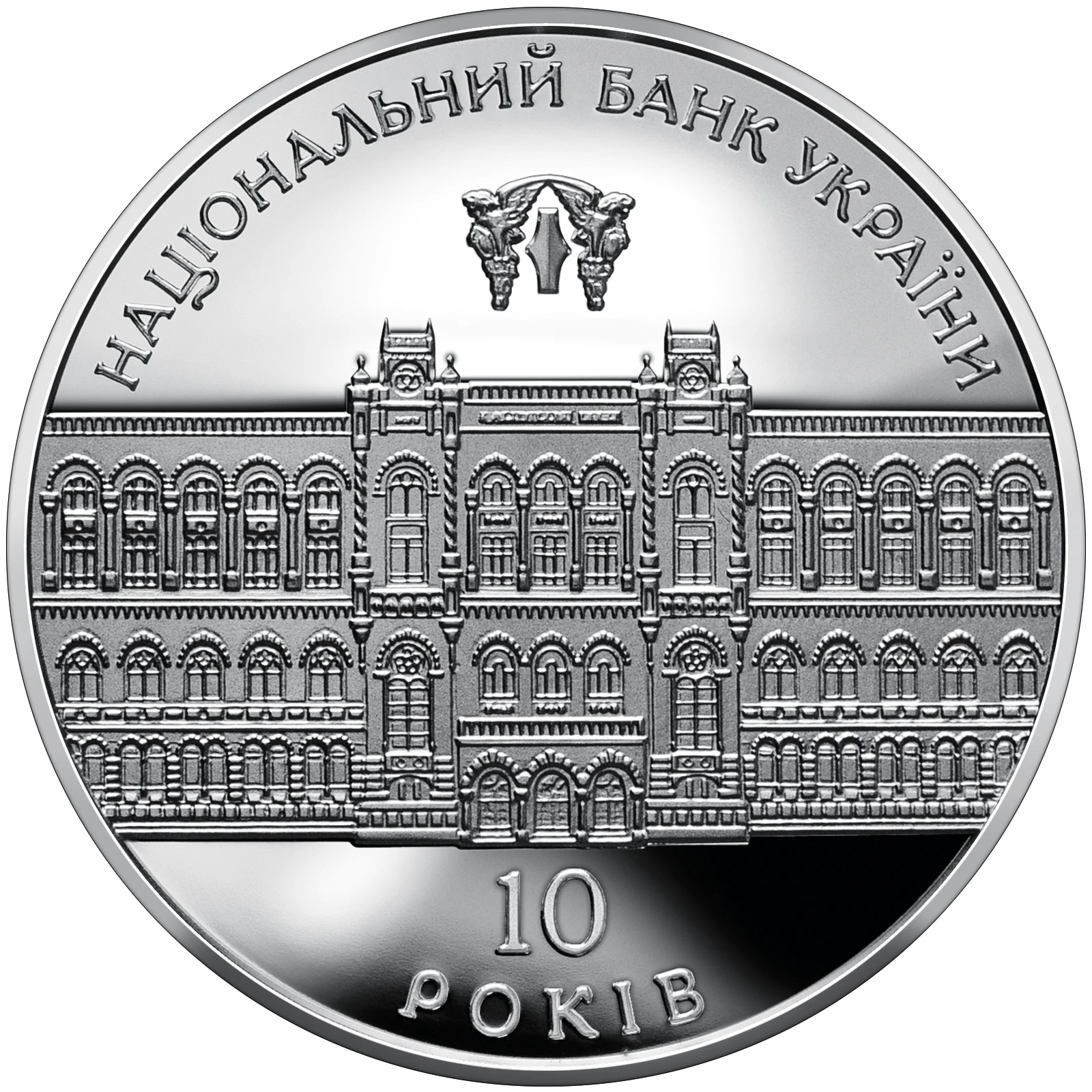 On the coin reverse there is depicted the facade of the bank`s capital building (architects: O.Kobeliev and O.Verbytskyi) above the building there is depicted the logotype of the National Bank of Ukraine and the circular inscription: НАЦІОНАЛЬНИЙ БАНК УКРАЇНИ (National Bank of Ukraine) and below: 10 РОКІВ (10 years).