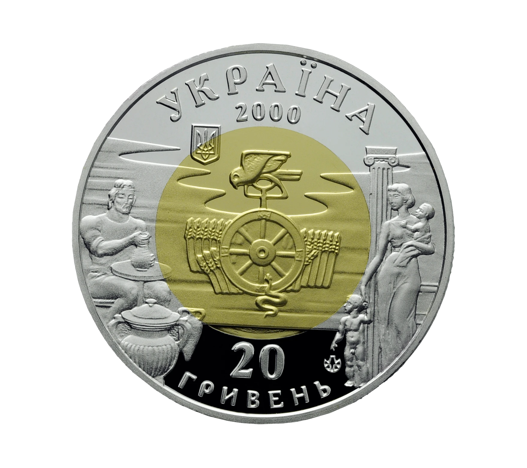 On the coin obverse in the centre of the insert ring and against the background of rye ears there is depicted of a symbolic wheel of history with a falcon sitting on it, underneath it there is depicted a snake; above and to the left there is the small National Emblem of Ukraine; within the outer ring, there are depicted a potter (on the left) right, a woman with children against the background of a Greek column (on the right), as well as the logotype of the NBU Mint and the inscriptions: УКРАЇНА / 2000 / 20 / ГРИВЕНЬ (Ukraine/ 20/ hryvnia/ 2000).