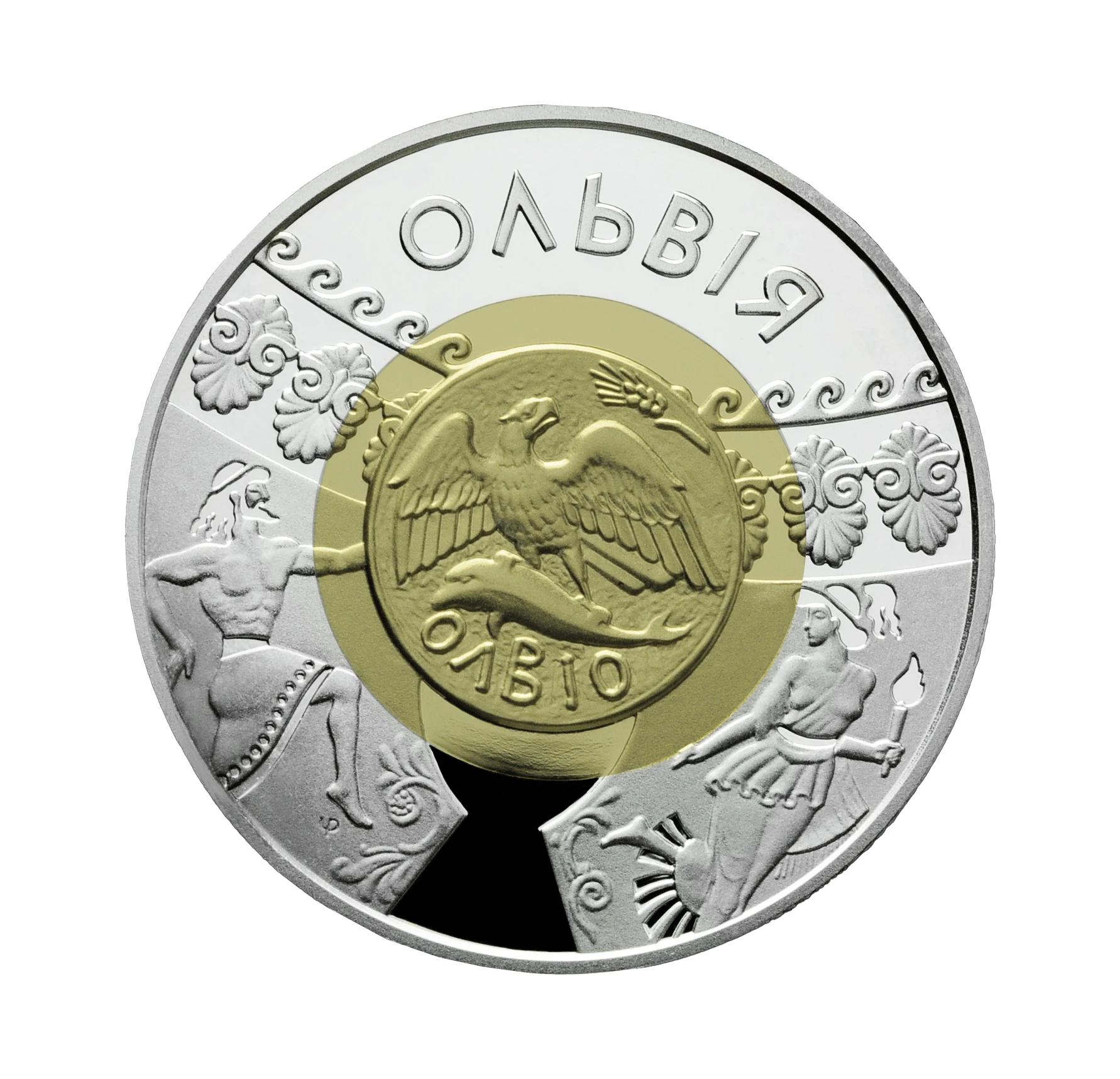 The coin is dedicated to the city-state Olbia, one of the most important centres of ancient material and spiritual culture of Northern and North-Western Region of the Black Sea coast, which was founded at the beginning of 6th century B.C. in the Lower Bug basin region and existed for about 1000 years. There was in the city quite original coin production, manufacturing cast copper dolphin-figures and arrows, which served as legal tender