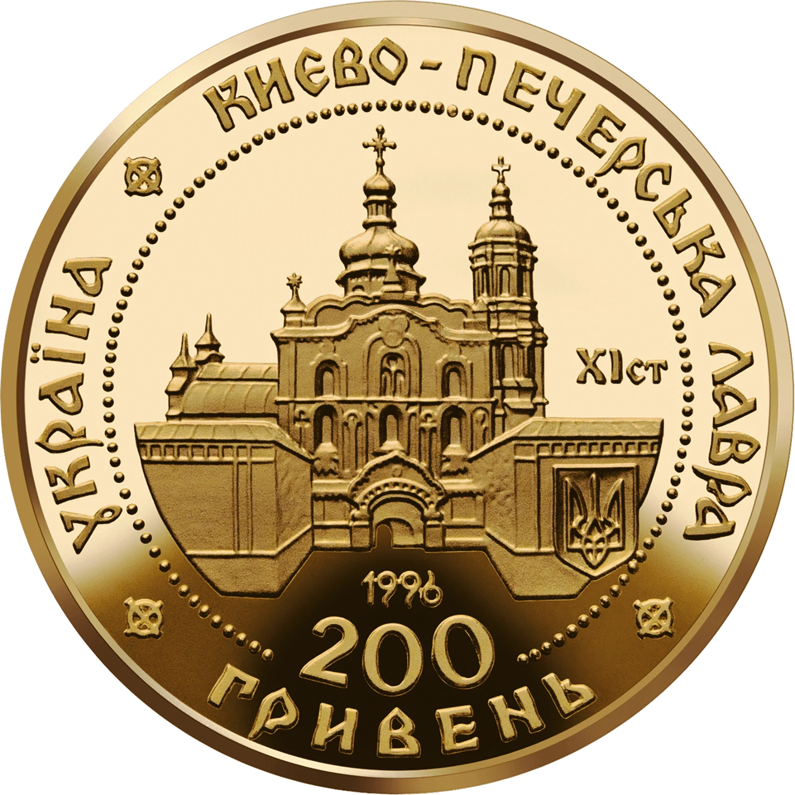On the coin obverse in the middle of the beads circumference decoration, there is the depiction of Trinity Gate Church of Lavra ensemble and a fragment of its main Belfry. To its right there is a depiction of the Small State Emblem of Ukraine. Underneath around the coin circumference there are inscriptions: 200 ГРИВЕНЬ - in two lines and 1996, year of issue - above it. Around the coin circumference there are inscriptions: УКРАЇНА - left and КИЕВО-ПЕЧЕРСЬКА ЛАВРА - right.