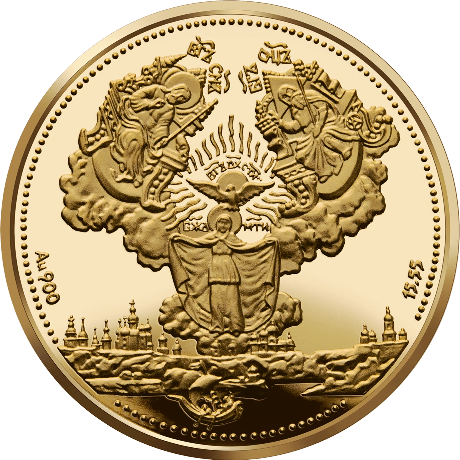 On the coin reverse at the composition upper part there are fragments of murals of the Trinity Gate Church: БОГ ОТЕЦЬ, БОГ СИН, БОГ ДУХ СВЯТИЙ with relative inscriptions in old Slavic print. Under it there is the depiction of God Mother, the patroness of Zaporizhzhia Cossacks. All images are depicted upon clouds. Underneath there is the Lavra panorama from L.Tarasevich`s engraving, first printed in the book Pateryk Pechorskiy (1702). The picture is framed with the beads circumference decoration. On both sides of the picture there are designations of Аu 900 and 15,55, coin`s pure weight
