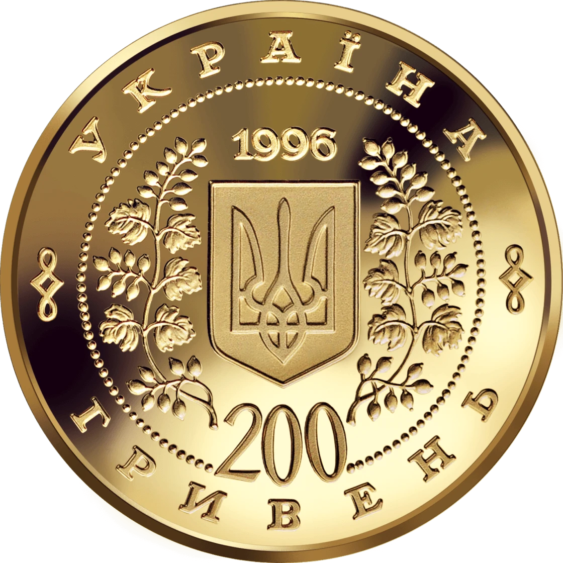 On the coin obverse there is the Small State Emblem of Ukraine in the middle of the beads circumference decoration, framed with guelder-rose sprays. Above the State Emblem there is the year of issue - 1996. Around the coin circumference there are inscriptions: УКРАЇНА - above and 200 ГРИВЕНЬ - underneath in two lines