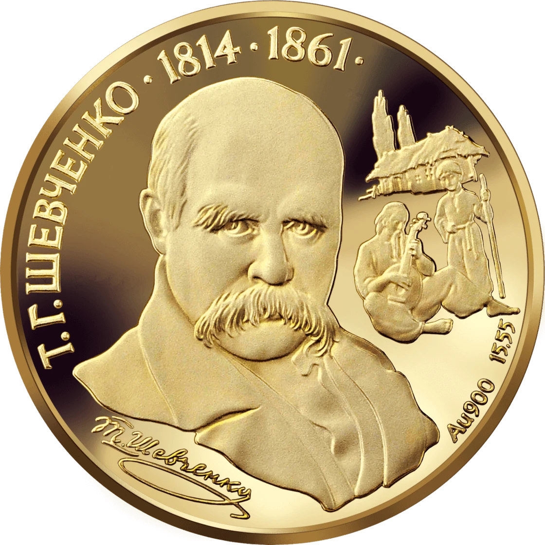 On the coin reverse in the centre there is a portrait of T.H.Shevchenko with a poet`s autograph under it. Near the portrait there is a singing Kobzar with a guide boy near a village house. Above, around the coin circumference there is an inscription: Т.Г.ШЕВЧЕНКО 1814-1861, underneath there are designations of Аu 900 and 15,55, coin`s pure weight.