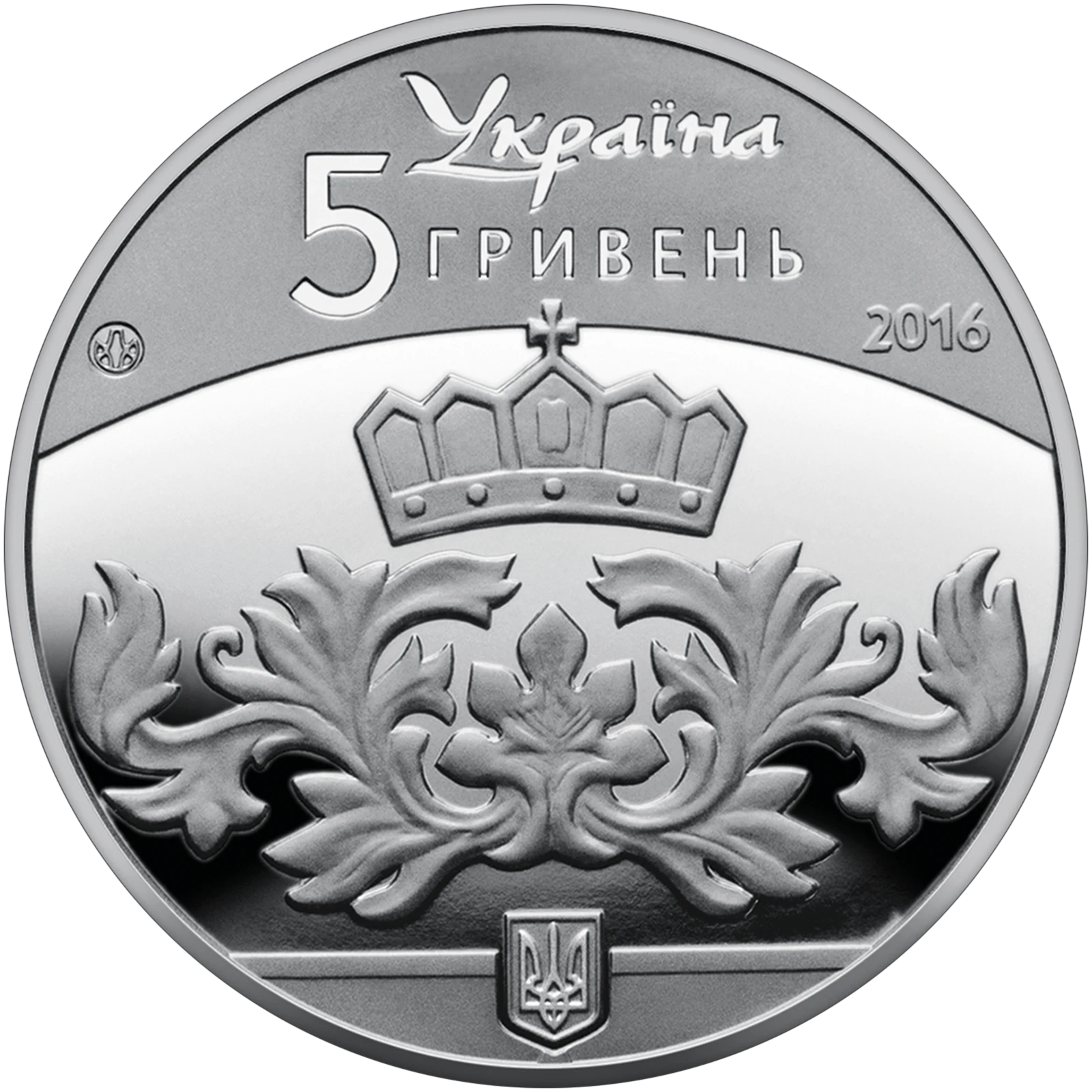Obverse (Kyiv Rus coin): above is the legend УКРАЇНА (Ukraine), the coin face value 5 ГРИВЕНЬ (5 hryvnias), the coin issue year 2016 (to the right), and the mint mark of the NBU Banknote Printing and Minting Works (to the left); in the center against a smooth background is a conventionalized crown that was worn by Kyiv princes and a floral ornament, below which is Ukraine`s small coat of arms.