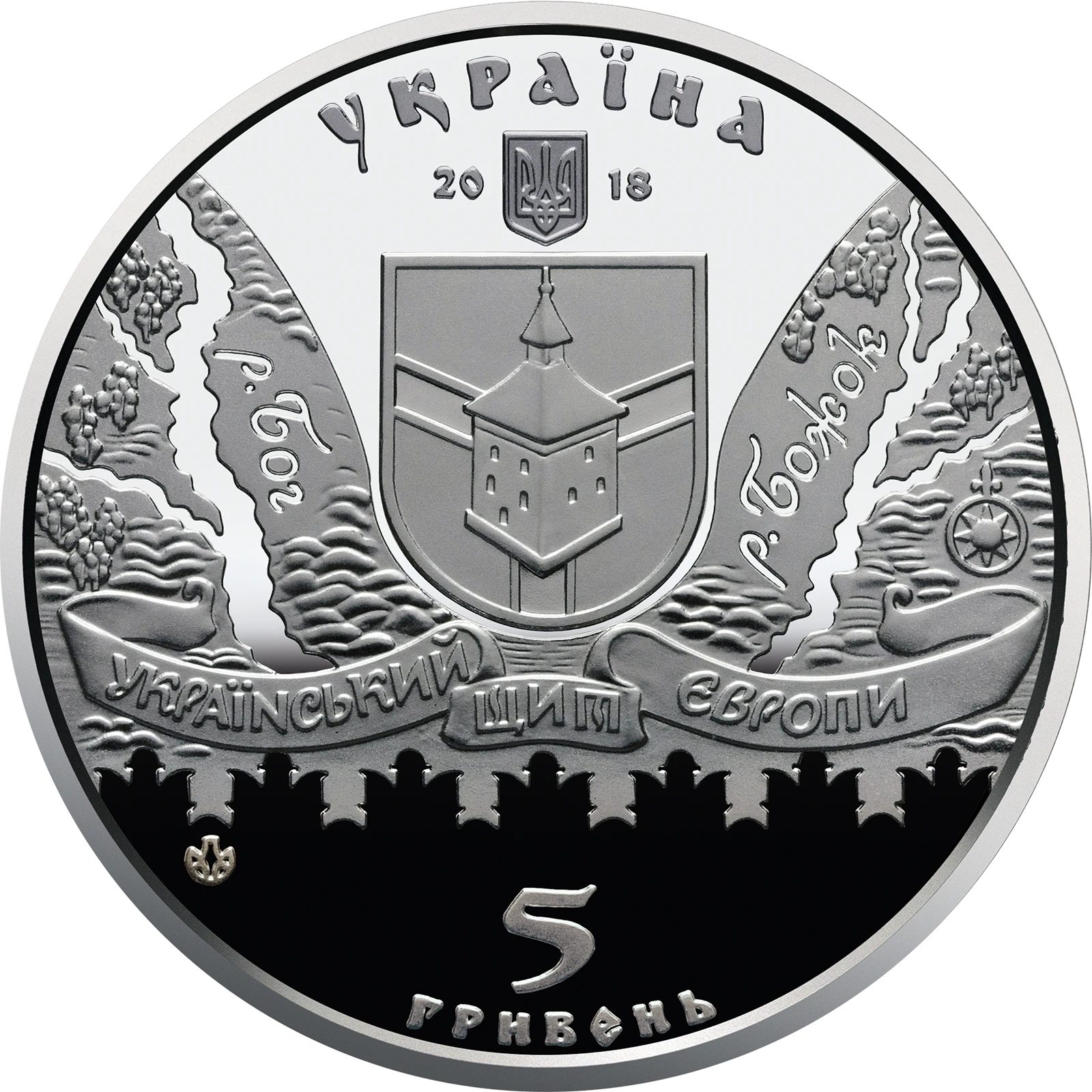 Obverse: above is the legend УКРАЇНА (Ukraine), below which is Ukraine’s small coat of arms; on both sides of the coat of arms are the numbers 20 and 18; in the center is the following composition: a shield depicting a tower, on both sides of which is a stylized map of the area with the legends р. Бог (the Boh River) (to the left) and р. Божок (the Bozhok River) (to the right) – the ancient names of the rivers; below the composition is a ribbon with the legend УКРАЇНСЬКИЙ ЩИТ ЄВРОПИ (the Ukrainian shield of Europe); beneath, against the background of merlons, is the coin face value 5/ГРИВЕНЬ (5/hryvnias); to the left, is the mint mark of the NBU Banknote Printing and Minting Works.