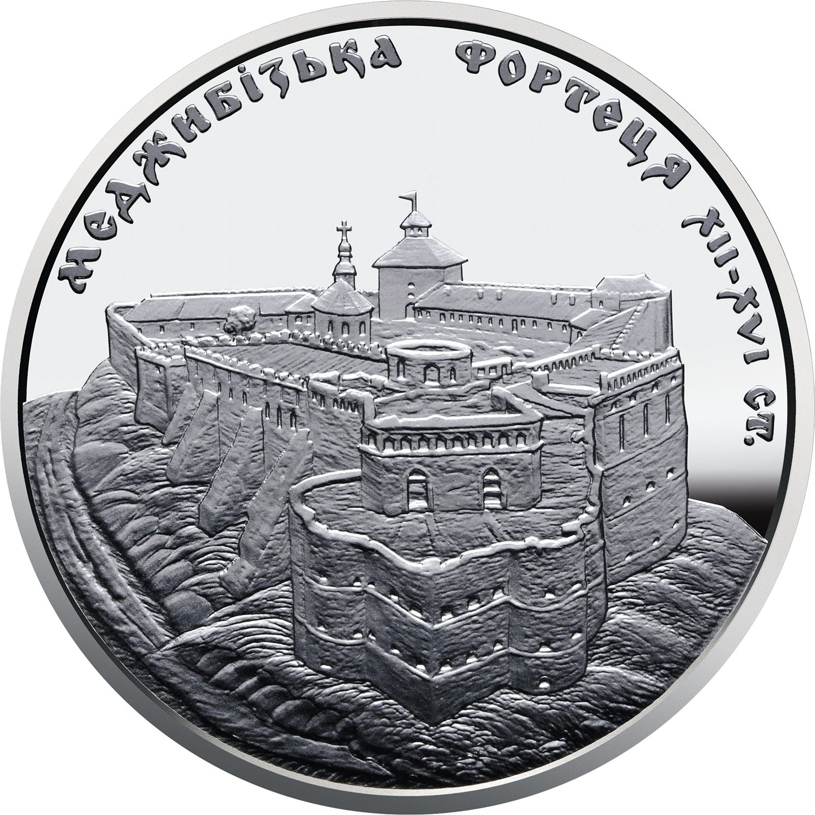 This coin celebrates Medzhybizh Castle. Located in a picturesque part of Khmelnytskyi Oblast on a promontory that lies on the confluence of the Southern Bug and the Buzhok rivers, the castle is one of the oldest fortifications in Ukraine. The castle, which has changed owners and form over the centuries, is one of Ukraine’s most prominent landmarks.