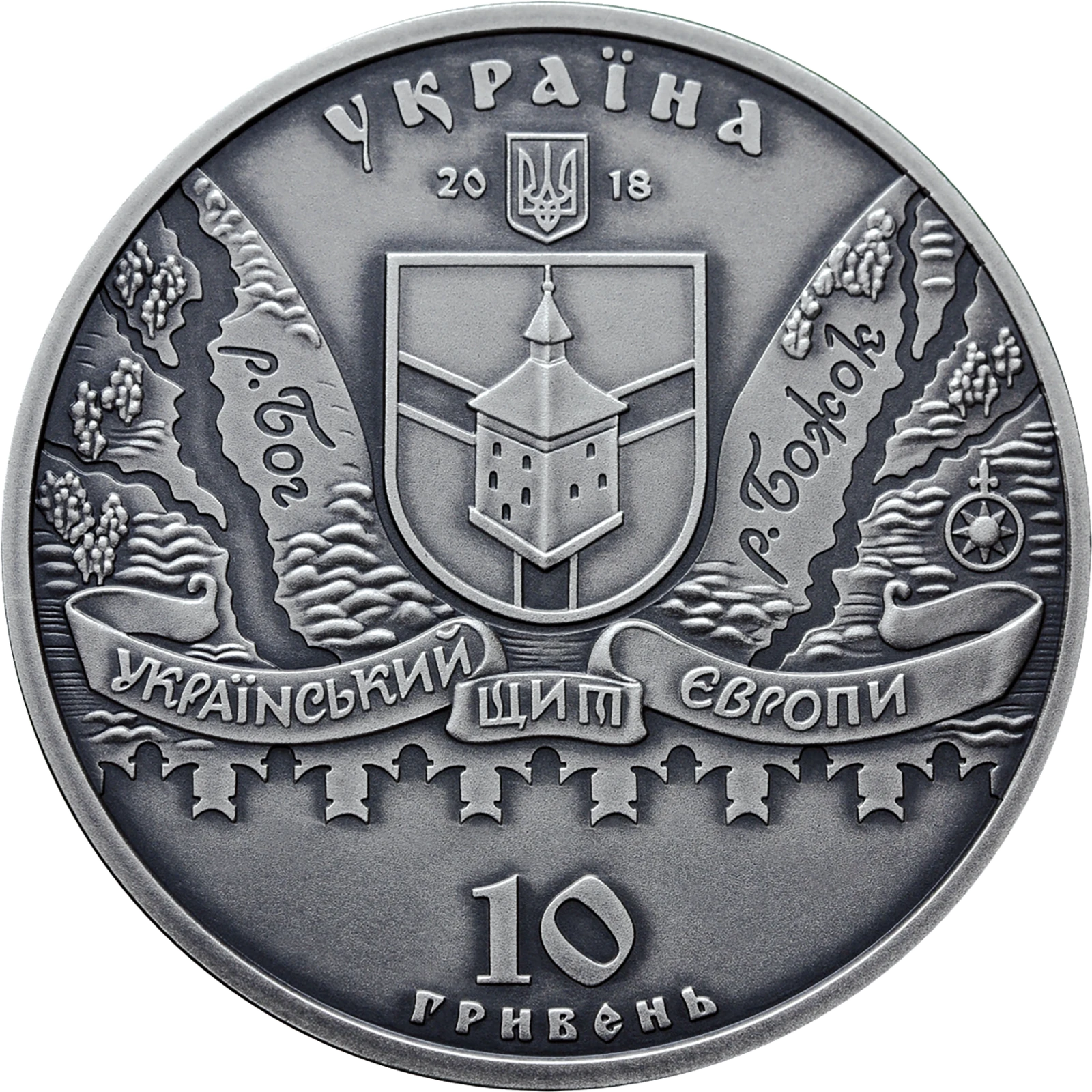 Obverse: above is the legend УКРАЇНА (Ukraine), below which is Ukraine’s small coat of arms; on both sides of the coat of arms are the numbers 20 and 18; in the center is the following composition: a shield depicting a tower, on both sides of which is a stylized map of the area with the legends р. Бог (the Boh River) (to the left) and р. Божок (the Bozhok River) (to the right) – the ancient names of the rivers; below the composition is a ribbon with the legend УКРАЇНСЬКИЙ ЩИТ ЄВРОПИ (the Ukrainian shield of Europe); beneath, against the background of merlons, is the coin face value 10/ГРИВЕНЬ (10/hryvnias).