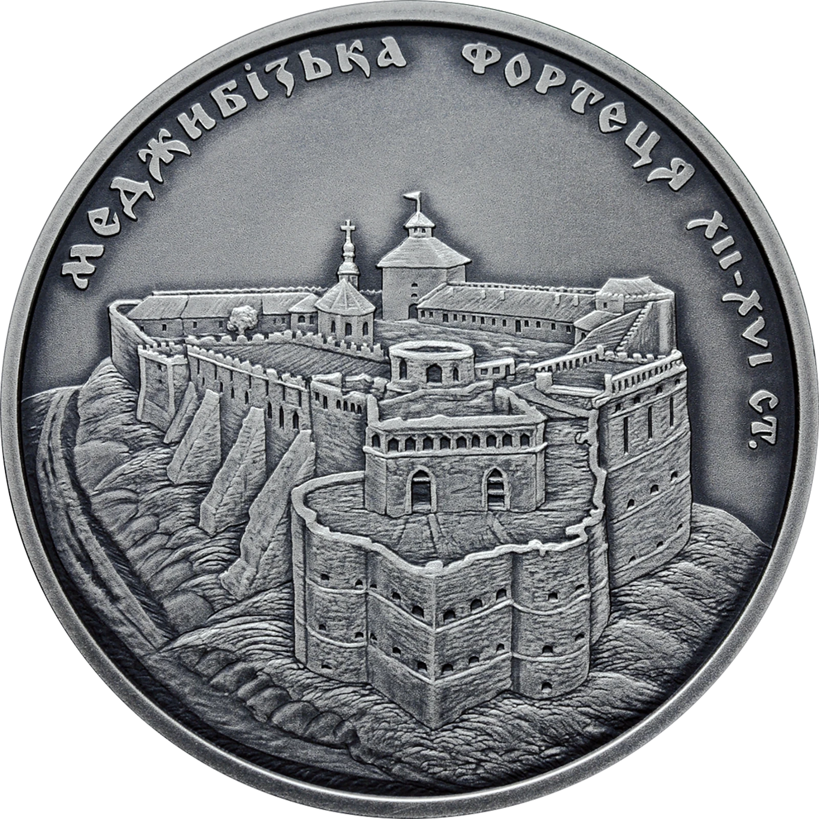 This coin celebrates Medzhybizh Castle. Located in a picturesque part of Khmelnytskyi Oblast on a promontory that lies on the confluence of the Southern Bug and the Buzhok rivers, the castle is one of the oldest fortifications in Ukraine. The castle, which has changed owners and form over the centuries, is one of Ukraine’s most prominent landmarks. This coin is covered with patina.