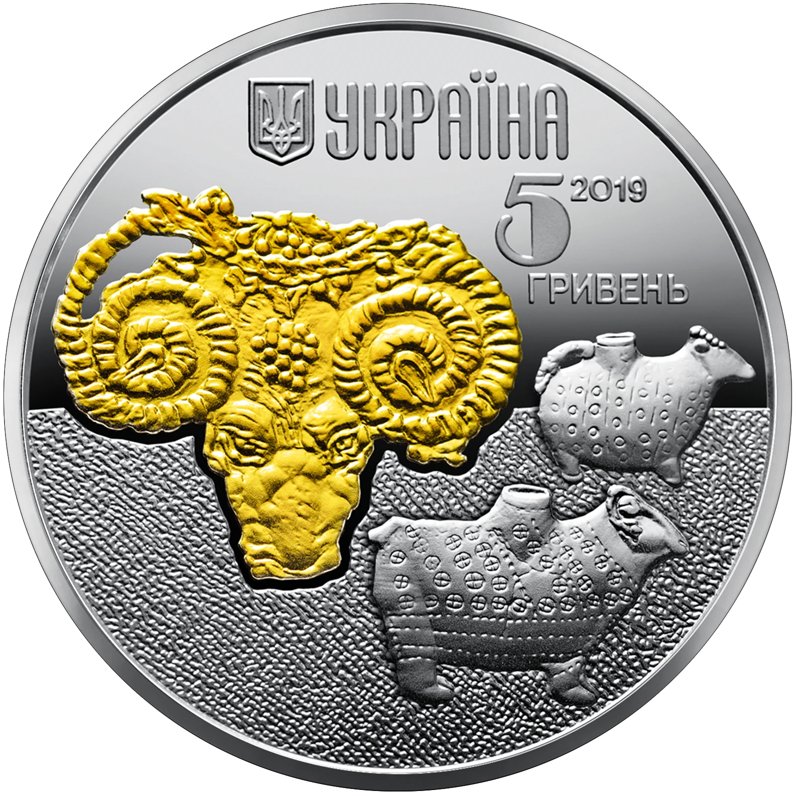 Obverse: above is Ukraine’s small coat of arms, to the right of which is the legend УКРАЇНА (Ukraine); below the legend are the coin face value 5/ГРИВЕНЬ (5/hryvnias) and the coin issue year 2019; in the center is a gilt image of a metal relief depicting a ram’s head* (found in the northern Black Sea region); to the right of the relief are Sarmatian archeological artefacts: two ceramic vessels shaped as rams found in the Neizats burial ground in Crimea.