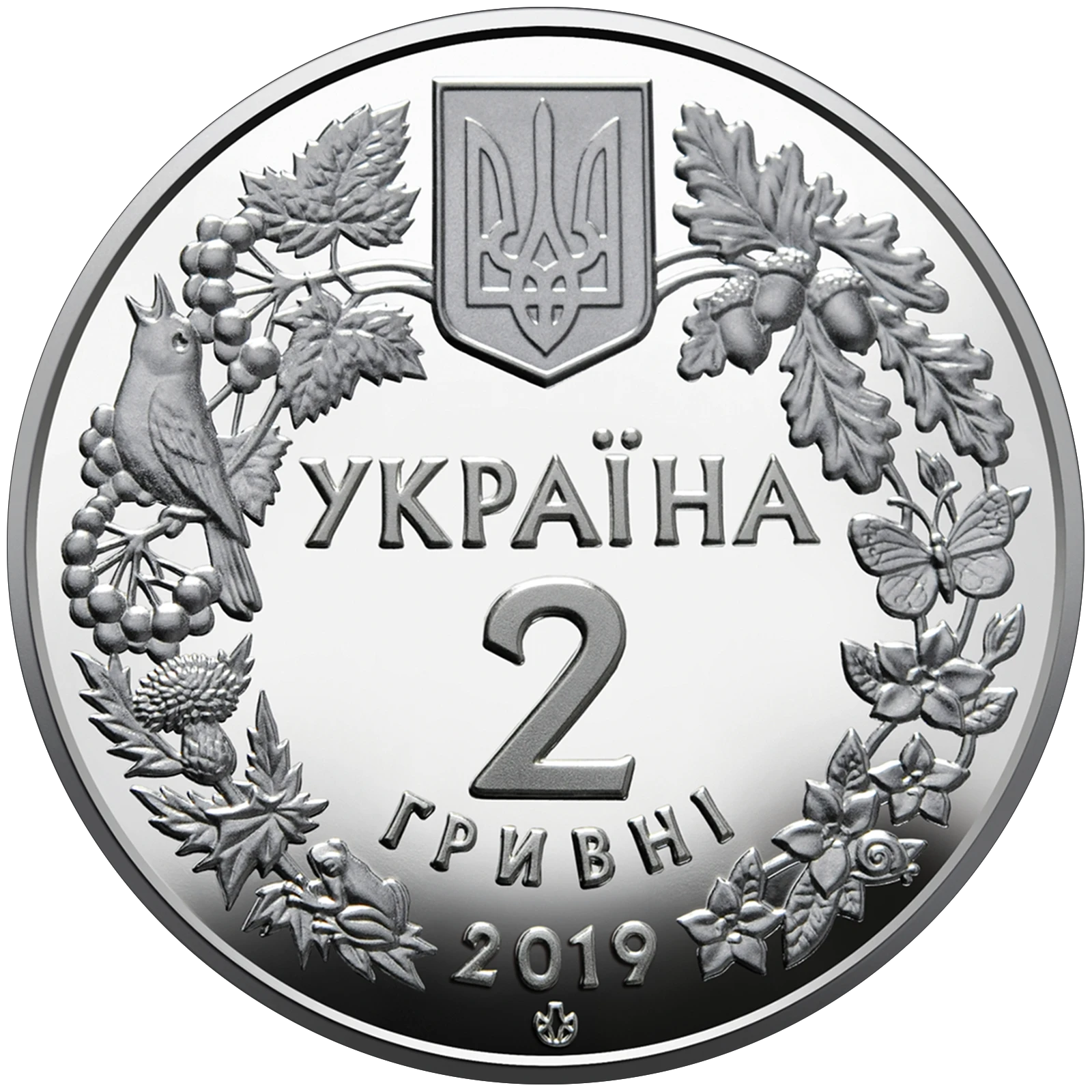 Obverse: in the center of a wreath made of images of some flora and fauna species are Ukraine`s small coat of arms and the following legends – УКРАЇНА/2/ГРИВНІ/2019 (Ukraine/2/hryvnias/2019), and mint mark of the NBU’s Banknote Printing and Minting Works.