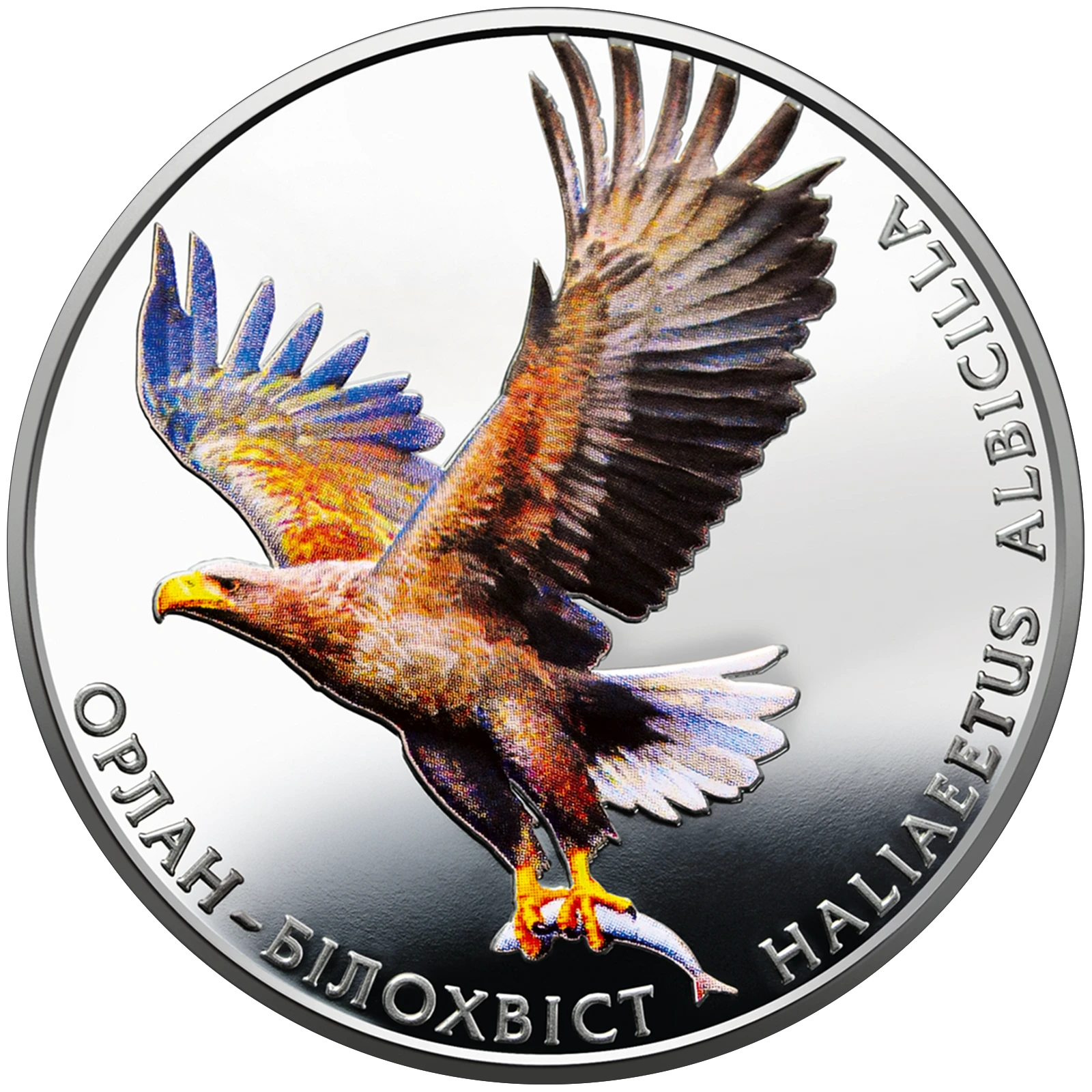These coins celebrate the white-tailed eagle (Haliaeetus albicilla) (Accipitriformes Order, Accipitridae Family), one of the largest birds of prey in Eurasia. This endangered species is on the Ukrainian and European Red Lists.