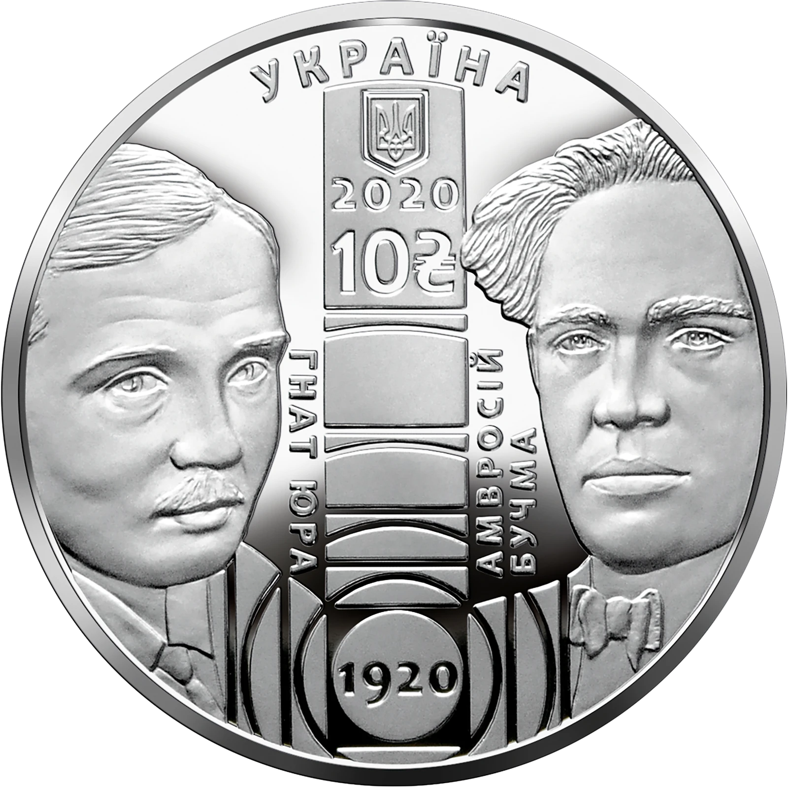 All coin sale ads on our websiteObverse (silver coin): there is Ukraine`s small coat of arms, above which is the semicircular legend УКРАЇНА (Ukraine), below the coat of arms are the coins’ issue year – 2020 and the face value 10 ?; against a smooth background, to the left, is a portrait of Hnat Yura, to the right of which is the vertical legend ГНАТ ЮРА (Hnat Yura); to the right is a portrait of Amvrosii Buchma, to the left of which is the vertical legend АМВРОСІЙ/БУЧМА (Amvrosii/Buchma). Yura and Buchma were among the theater’s founders. Beneath is the legend 1920, the year when the theater was founded.