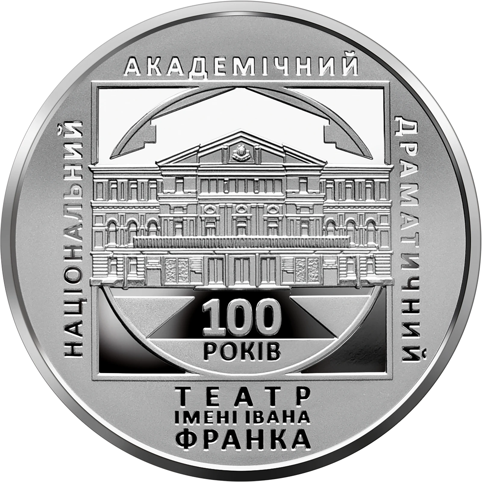 Reverse: there is a stylized composition that resembles the logotype of the theater: in a square frame, against a smooth background, is a relief image of the theater; against a matt background are the following legends: 100/РОКІВ (100/years) (under the building); НАЦІОНАЛЬНИЙ (national) (vertical, to the left); АКАДЕМІЧНИЙ (academic) (above); ДРАМАТИЧНИЙ (drama) (vertical, to the right); ТЕАТР/ІМЕНІ ІВАНА/ФРАНКА (Ivan/Franko/theater) (beneath).