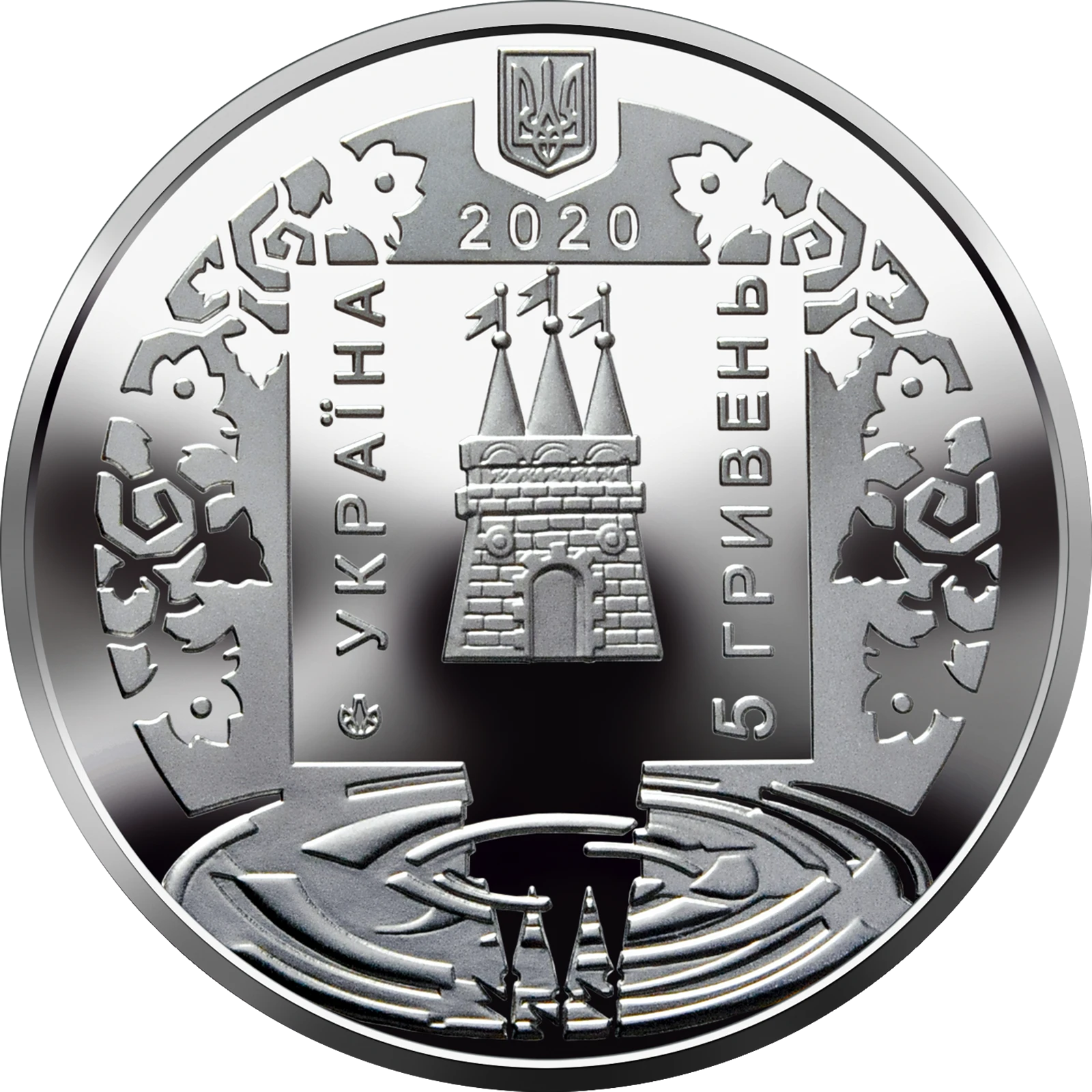 All coin sale ads on our websiteObverse: above is Ukraine’s small coat of arms, below which is the coin’s issue year 2020; in a square, against a smooth background, are the town’s coat of arms reflected in water and the vertical legends УКРАЇНА (UKRAINE) (to the left of the coat of arms) and the face value 5 ГРИВЕНЬ (5 HRYVNIAS) (to the right of the coat of arms); around the square is a decorative ornament; there is also the mint mark of the NBU’s Banknote Printing and Minting Works (under the legend UKRAINE).