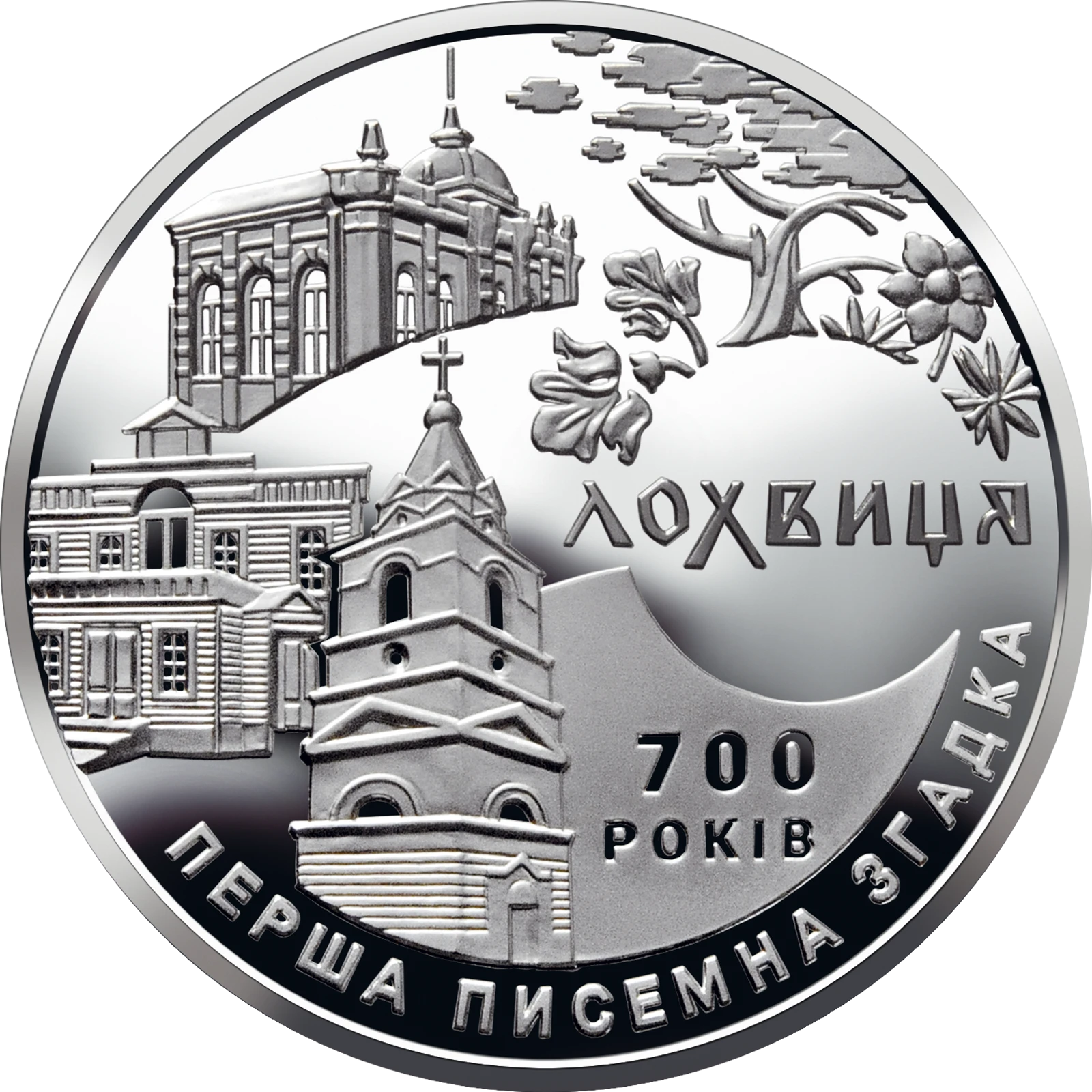 Reverse: against a smooth background is a composition consisting of the architectural monuments of Lokhvytsia; above, to the right, is a stylized oak and plants symbolizing the beauty of nature. There are also the following legends: ЛОХВИЦЯ LOKHVYTSIA (under the plants), 700 РОКІВ (700 YEARS) (to the right of the bell tower), and ПЕРША ПИСЕМНА ЗГАДКА (FIRST WRITTEN MENTION) (below, in a semicircle).