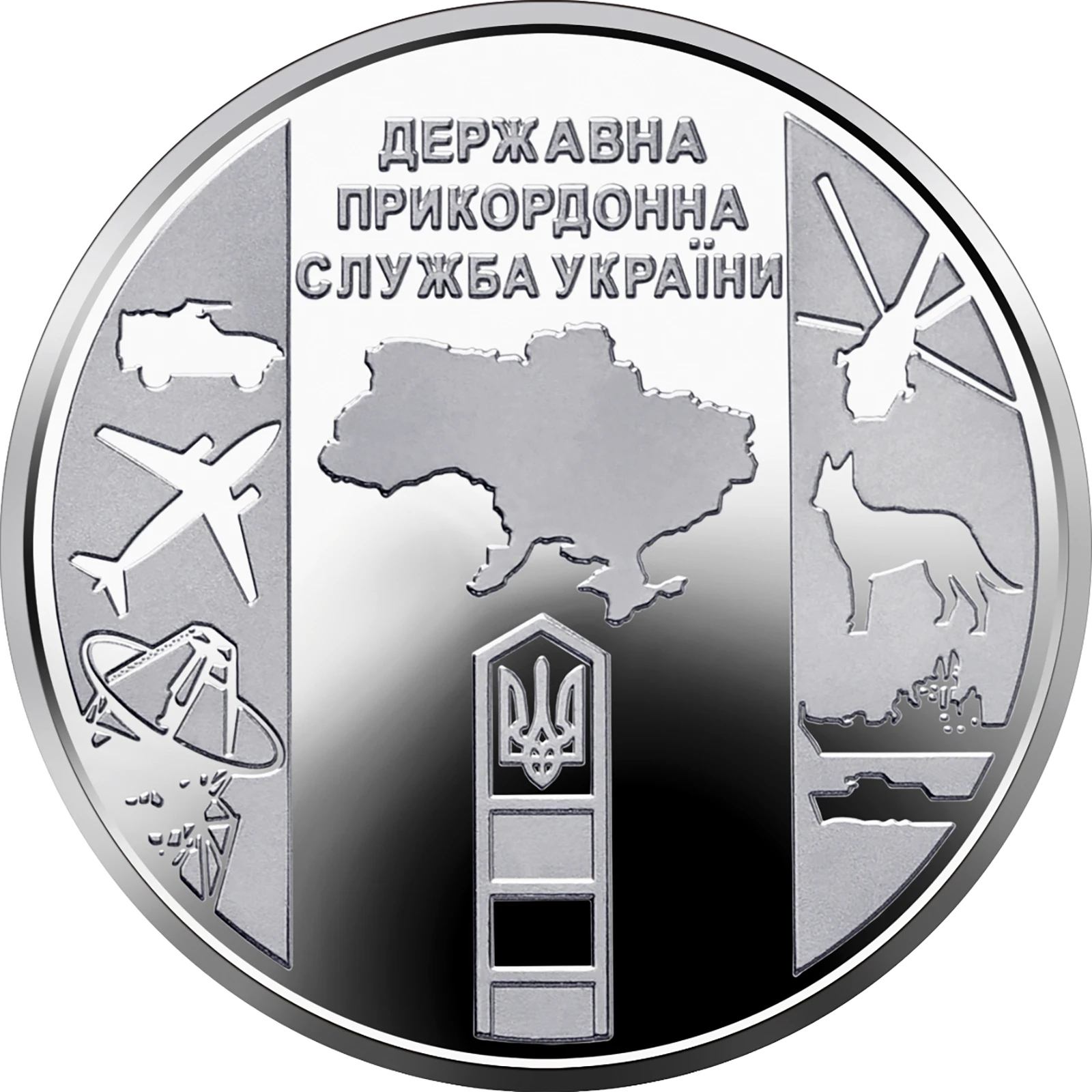 Reverse: above is the legend ДЕРЖАВНА/ПРИКОРДОННА/СЛУЖБА УКРАЇНИ (Ukraine’s State Border Guard Service), below which is an outline of a map of Ukraine; beneath is a symbolic border marker; to the right and left are compositions that symbolize the activities of the State Border Guard Service in the air, on land and at sea.