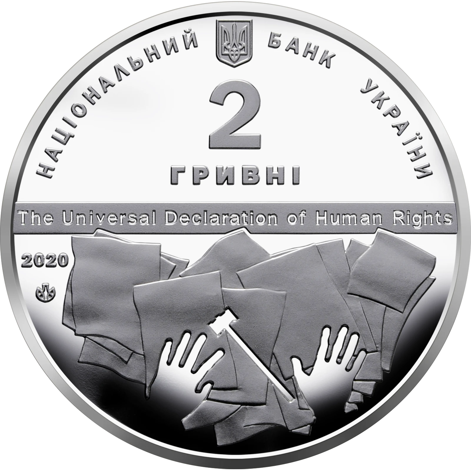 Obverse: above is Ukraine`s small coat of arms; to the left of the coat of arms is the legend НАЦІОНАЛЬНИЙ (National), to the right of the coat of arms is the legend БАНК УКРАЇНИ (Bank of Ukraine), the legend 2/ ГРИВНІ (2/hryvnias) is below the coat of arms; in the center is the legend THE UNIVERSAL DECLARATION OF HUMAN RIGHTS; to the left is the coin’s issue year – 2020, below which is the mint mark of the NBU Banknote Printing and Minting Works; beneath, against the background of sheets of paper, are the images of hands and a gavel, which symbolize the process of making court rulings).