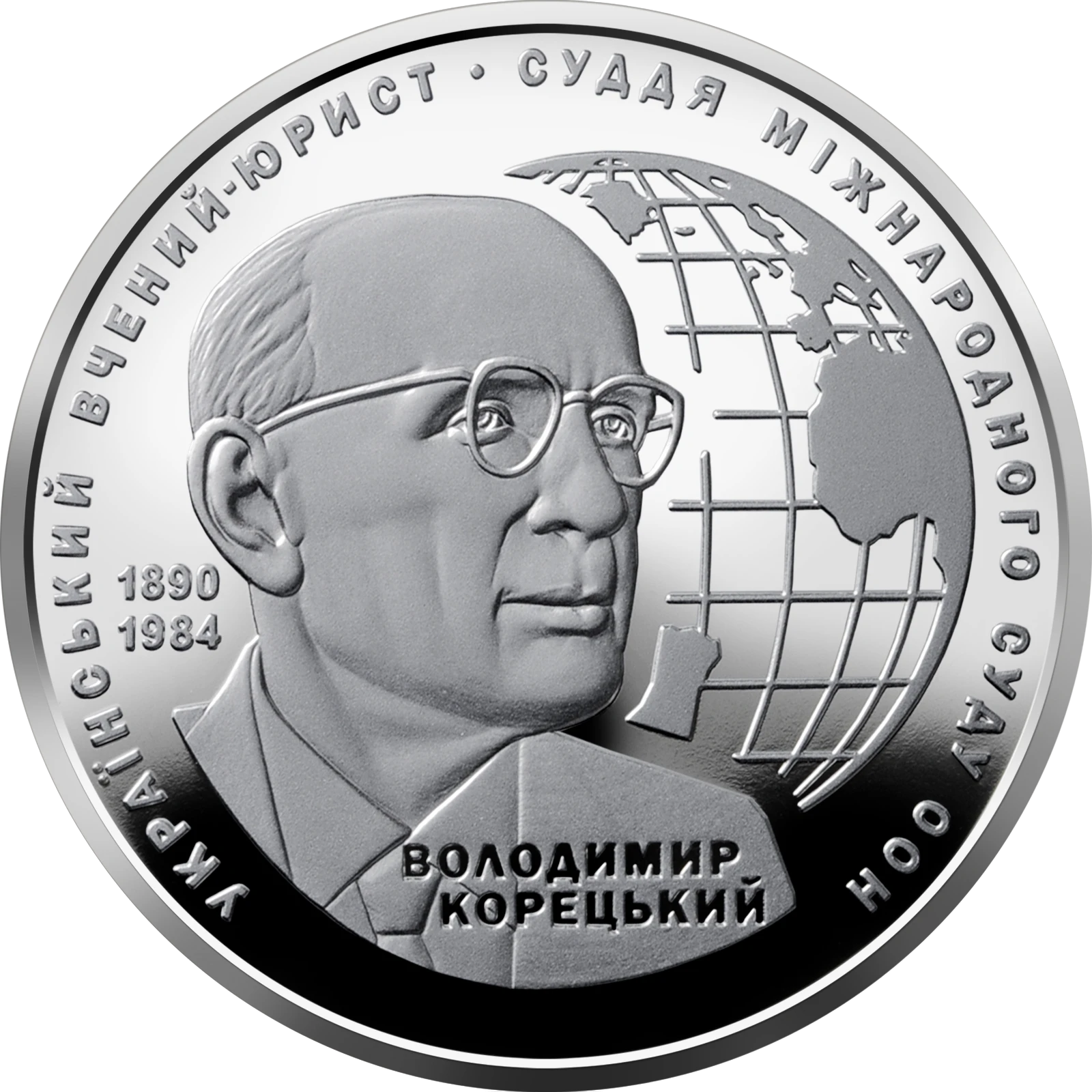 Obverse: against the backdrop of a globe symbolizing Koretskyi’s international activities, is his portrait; under the portrait is the legend ВОЛОДИМИР/ КОРЕЦЬКИЙ (Volodymyr/ Koretskyi), to the left of the portrait are the years of his birth and death 1890/1984; there is the following circular legend: УКРАЇНСЬКИЙ ВЧЕНИЙ-ЮРИСТ СУДДЯ МІЖНАРОДНОГО СУДУ ООН (Ukrainian scientist and lawyer ? judge of the UN International Court of Justice).