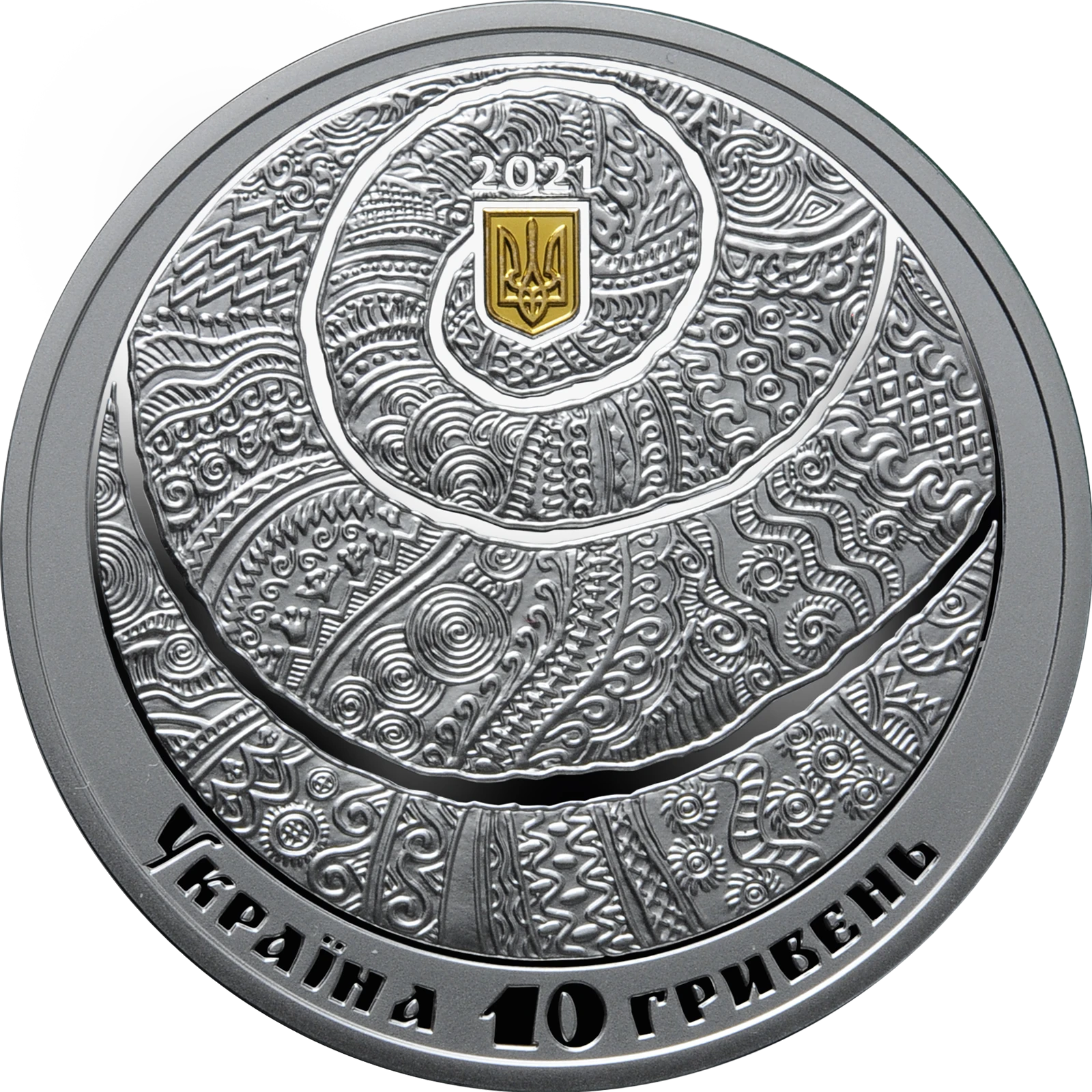 Obverse: above is Ukraine`s small coat of arms (gold-plated), above which is the coin’s issue year – 2021; beneath are the following semicircular legends: УКРАЇНА (Ukraine) and 10 ГРИВЕНЬ (10 hryvnias); in the center is a spiral decorated with signs, symbols, protective amulets and ornaments – a symbol with multiple meanings depicting the evolution of the Universe, development, continuity, the rhythm of breathing, and life itself.