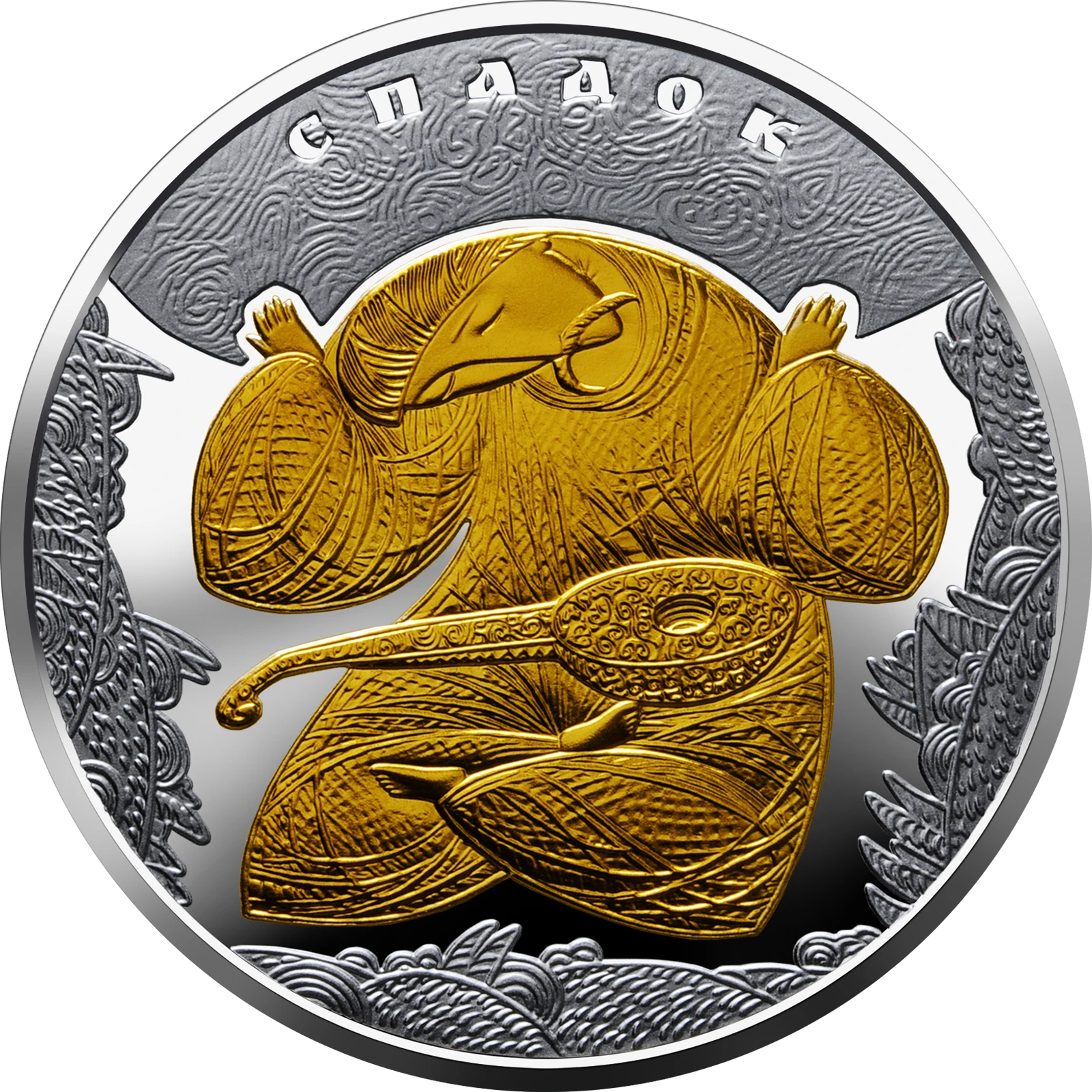 Reverse: surrounded by stylized vegetation symbolizing Ukraine’s picturesque landscapes is a gold-plated figure of Cossack Mamay, who embodies the Ukrainian mindset and represents the love for freedom, and the immortality of the Ukrainian people. The Cossack holds a stylized Ukrainian sky, Ukrainian culture, and the inheritance built up by the people over many centuries. Above is the legend СПАДОК (inheritance).