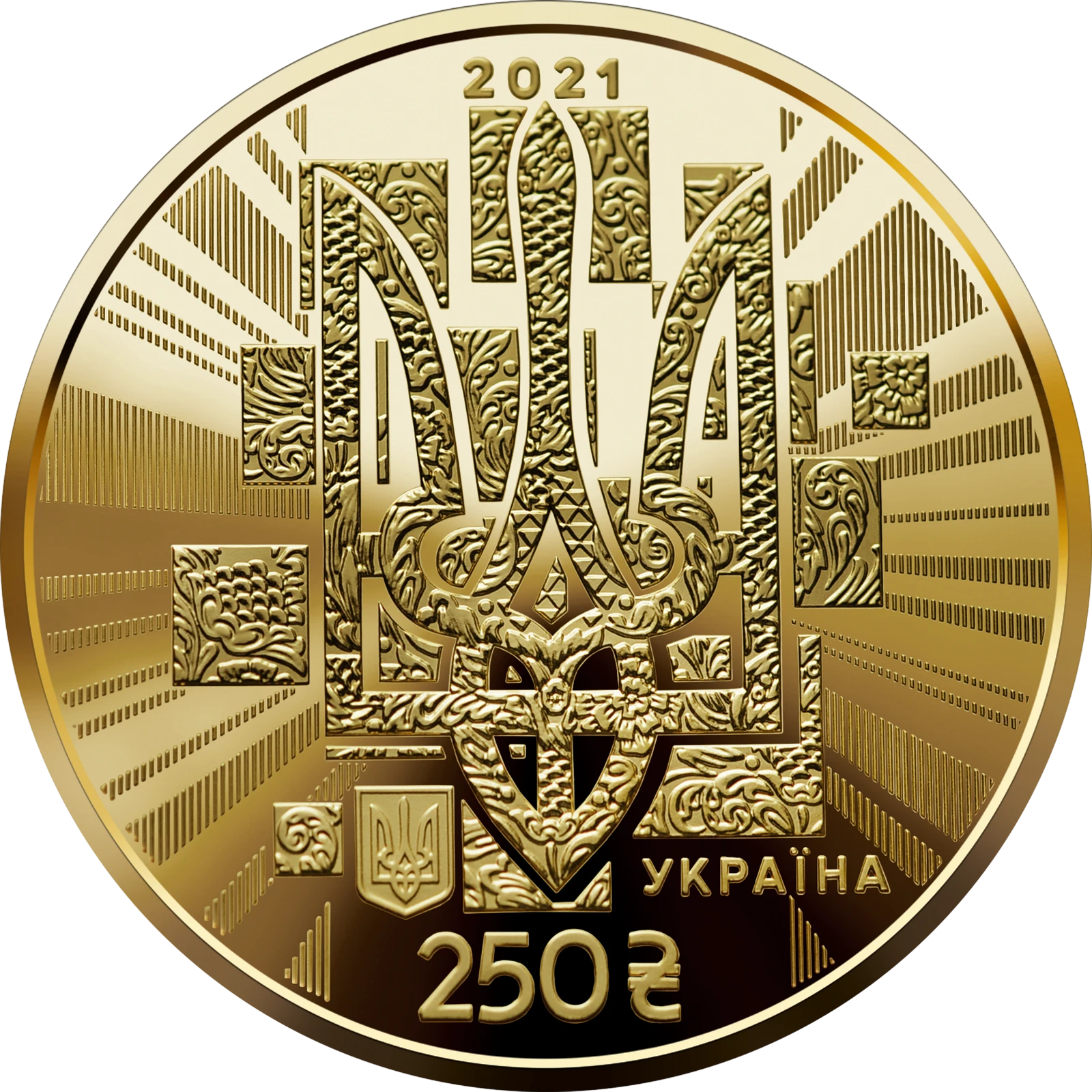 There are no ads yet. Put up for saleObverse: in the center is a mosaic image of the trident (a state symbol used by Kyiv Rus Prince Volodymyr the Great) decorated with a floral ornament and symbolizing the formation of the state, which contributes to the consolidation and development of the Ukrainian nation, its conventional wisdom, traditions and culture; above the trident is the coin’s issue year 2021; beneath, to the left, is Ukraine`s small coat of arms; the legend УКРАЇНА (Ukraine) is beneath, to the right; the coin’s face value 250 and the graphic symbol of the hryvnia are below on a smooth background.