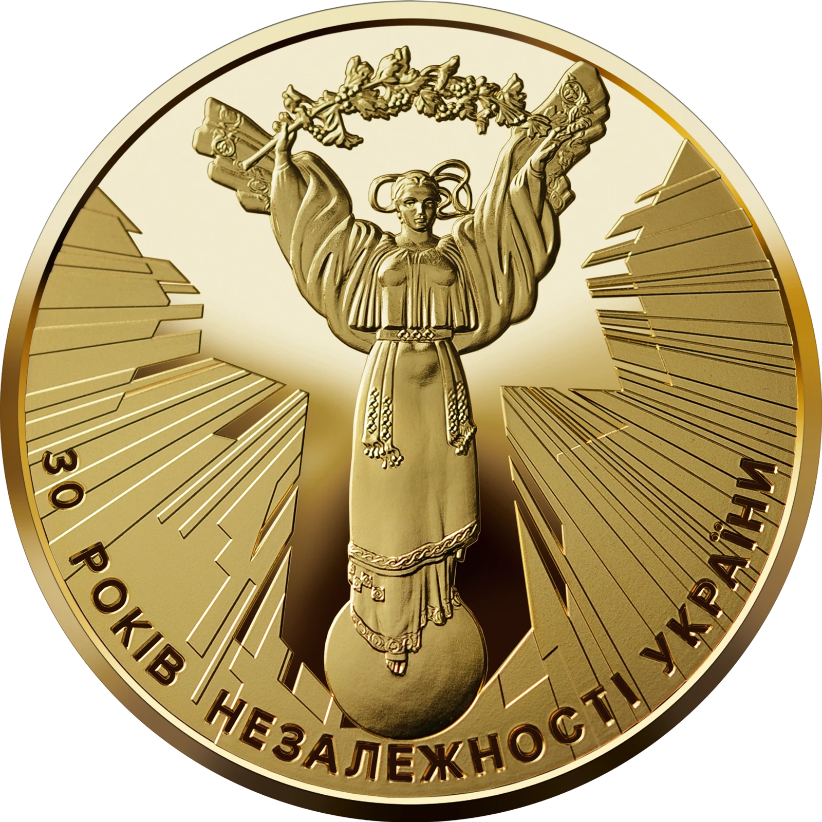 Reverse: surrounded by stylized sunrays is the main sculpture of Ukraine’s Independence Monument designed by Anatolii Kushch – Victorious Oranta (Orans) holding a red guelder rose branch; beneath is the following semicircular legend: 30 РОКІВ НЕЗАЛЕЖНОСТІ УКРАЇНИ (30th Anniversary of Ukraine’s Independence).
