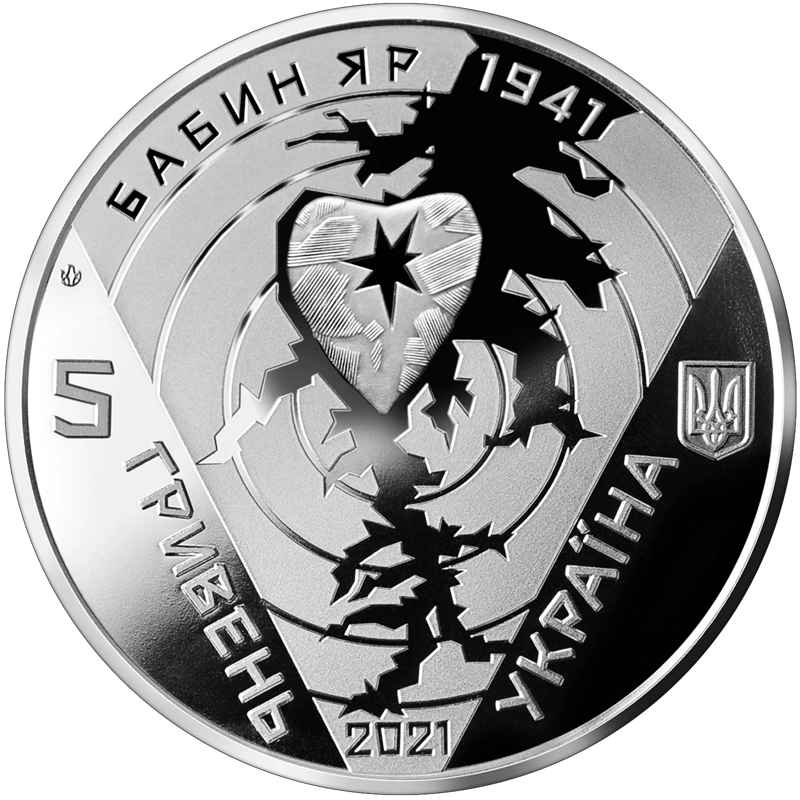 Obverse: to the right is Ukraine’s small coat of arms, under which is the angled legend УКРАЇНА (Ukraine); to the left is the angled face value 5 ГРИВЕНЬ (5 hryvnias); in the center, against the background of concentric circles that resemble a target and a fragment of a topographic image of the Babyn Yar area that resembles blood splashes, is the following stylized composition: a heart with a bullet hole in it; there are the following legends: БАБИН ЯР 1941 (Babyn Yar 1941) (semicircular, above) and the coin’s issue year – 2021 (below); above, to the left is the mint mark of the NBU’s Banknote Printing and Minting Works.