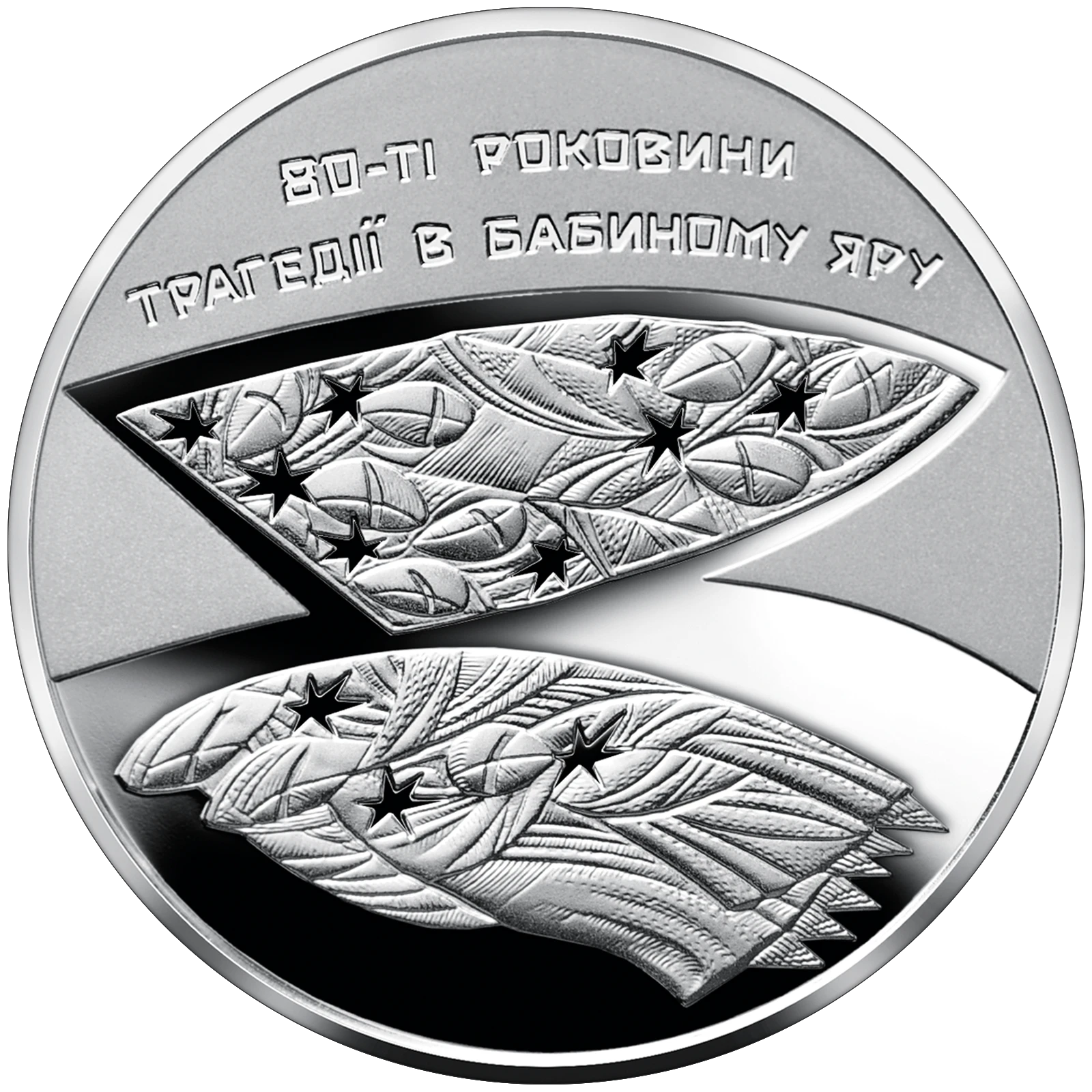 This coin commemorates 80 years since the tragedy that occurred in the Babyn Yar area in Kyiv during World War II. From September 1941 until the end of September 1943, regular mass shootings and burials took place there. The Babyn Yar area is the grave site of over 100,000 people. The victims of the Nazis were mostly Jews, but also Gypsies, Ukrainians and other nationalities.