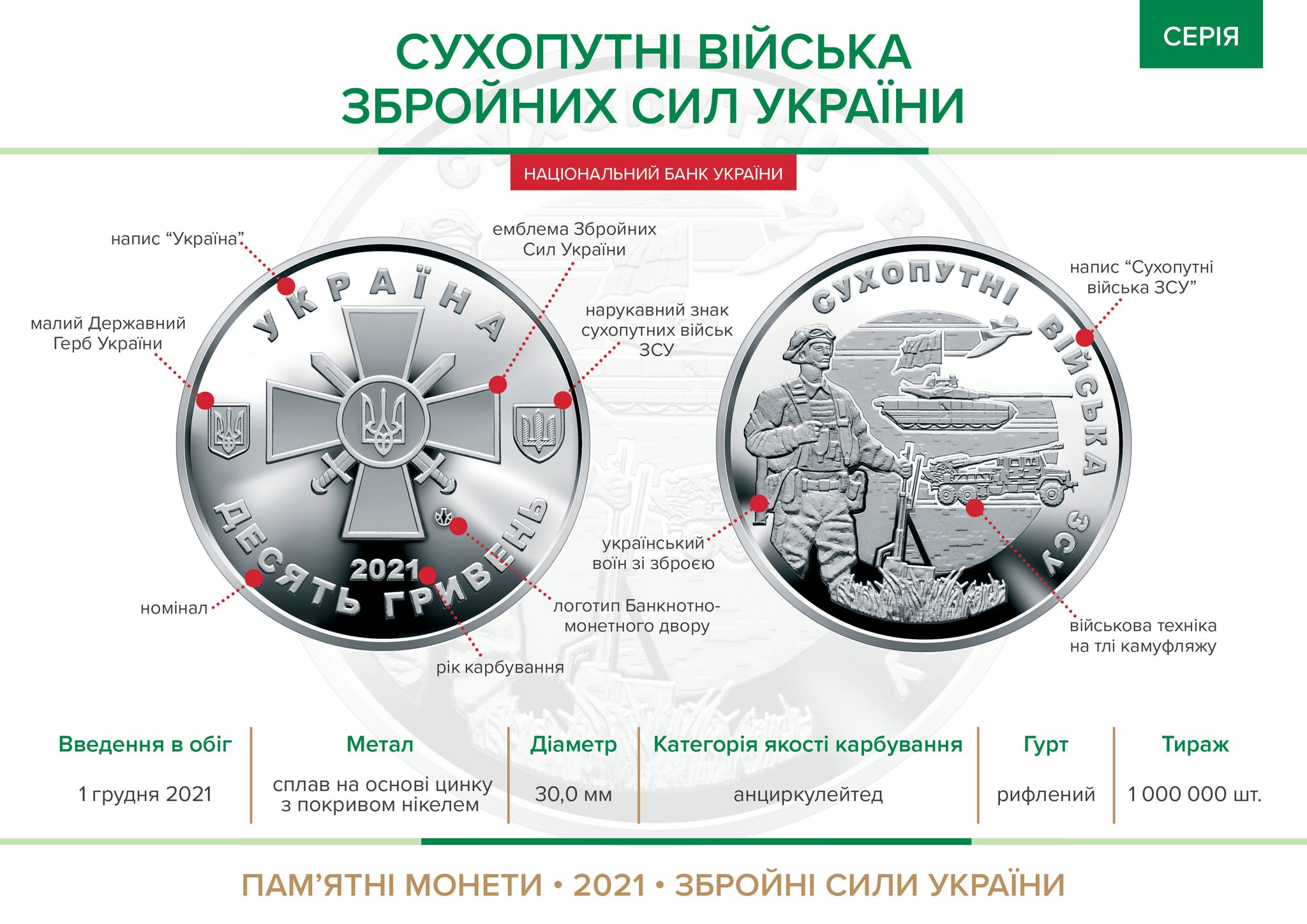 All coin sale ads on our websiteObverse: above is the semicircular legend УКРАЇНА (Ukraine); in the center, against a smooth background, is the emblem of the ground forces of Ukraine’s Armed Forces; to the left of the emblem is Ukraine`s small coat of arms, to the right of the emblem is the shoulder patch of the Ukrainian ground forces; under the emblem are the coin issue year – 2021 and face value ДЕСЯТЬ ГРИВЕНЬ (ten hryvnias) (semicircular); the mint mark of the NBU’s Banknote Printing and Minting Works is beneath, to the right of the emblem.