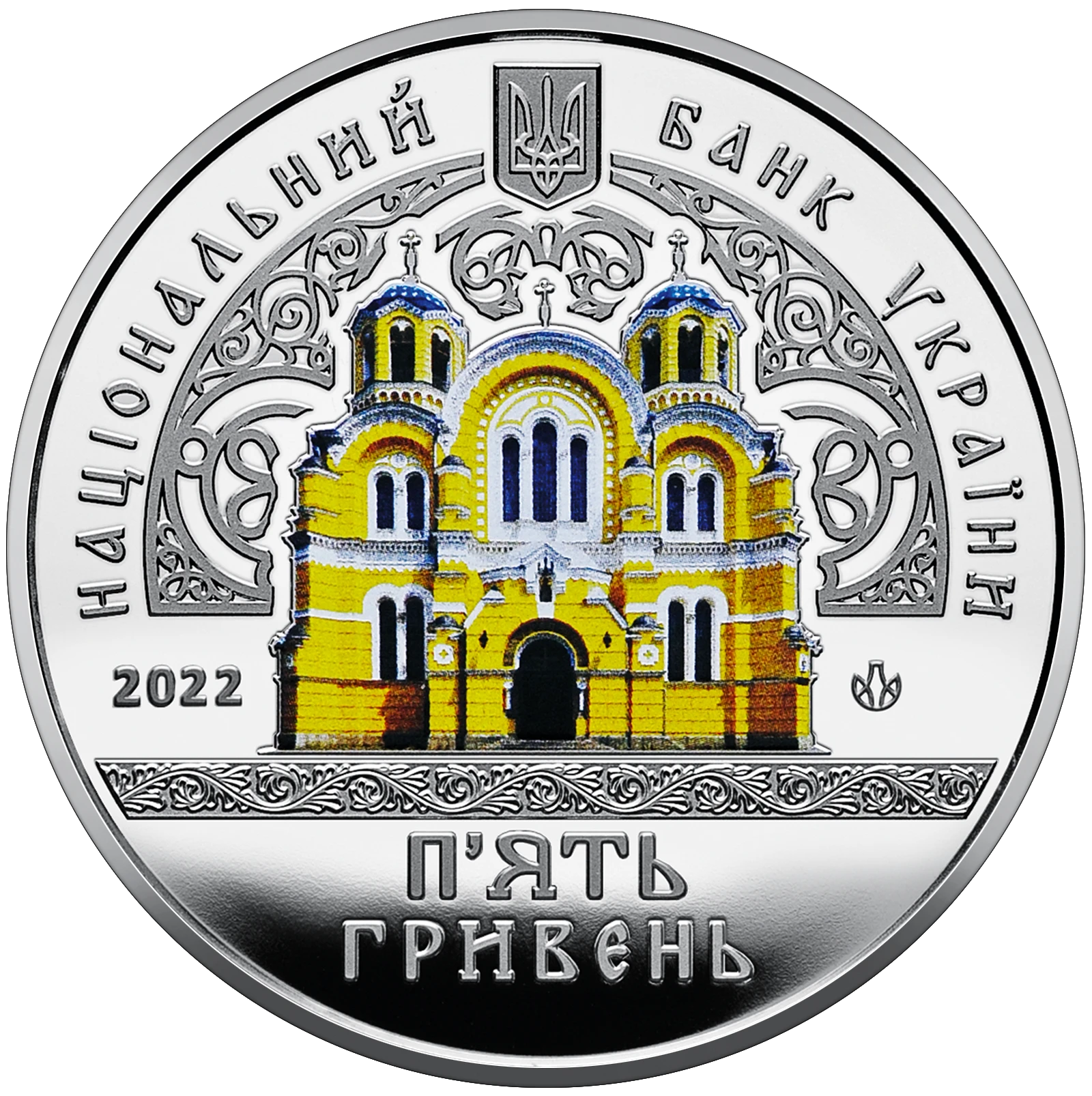 On the obverse side of the coin is placed: at the top on a mirror background - a small State Coat of Arms of Ukraine, to the right and left of which is the inscription NATIONAL BANK OF UKRAINE in a semicircle; on an ornamental background - the main facade of the cathedral (pad printing was used), under which there is an ornamental frieze; at the bottom, the denomination of the coin is FIVE/HRYVYNA; mint year 2022 - to the left of the cathedral, the logo of the Mint of the National Bank of Ukraine - to the right.