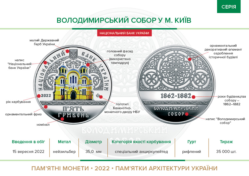 The commemorative coin is dedicated to one of the architectural pearls of Kyiv - Volodymyr's Cathedral. Built in the neo-Byzantine style, it attracts attention both with its history and interior painting - a real masterpiece of art. A significant number of donations were collected for the construction of the cathedral, which lasted 20 years - from 1862 to 1882. For more than 10 years, work continued on the interior decoration of the temple, the unique paintings of which are its main value.