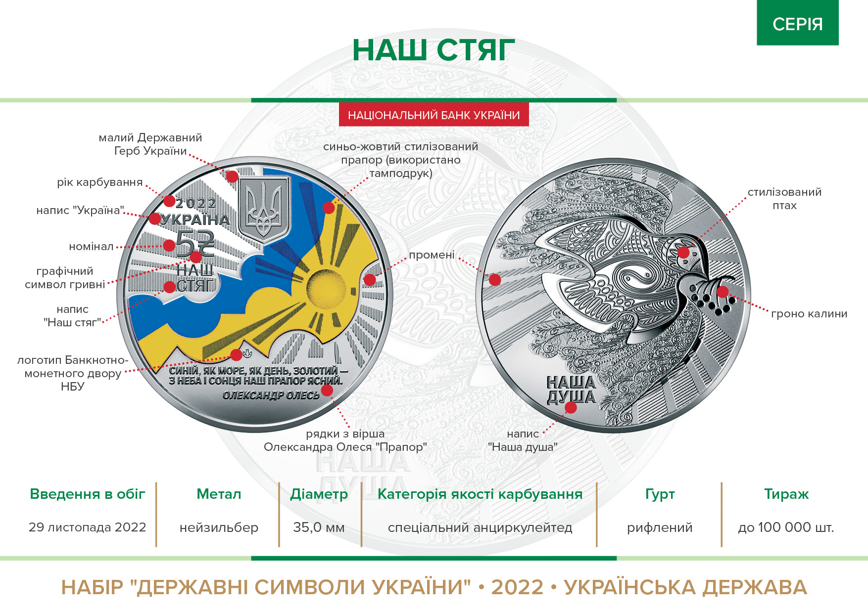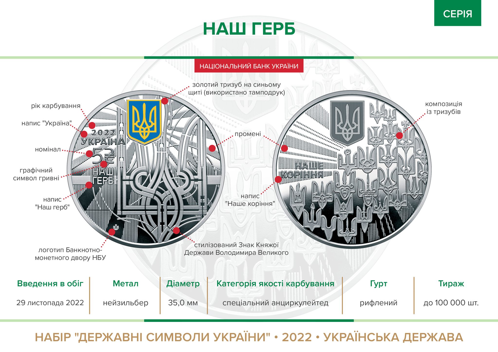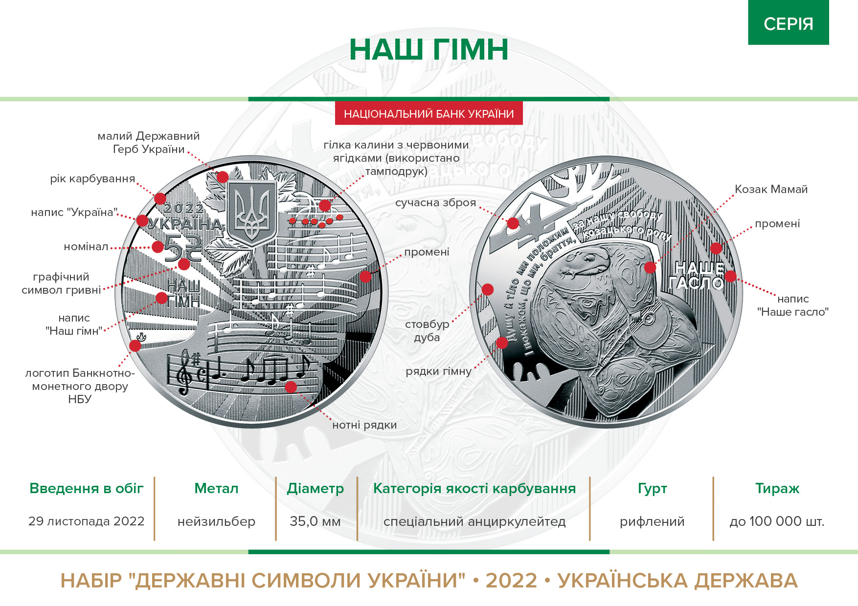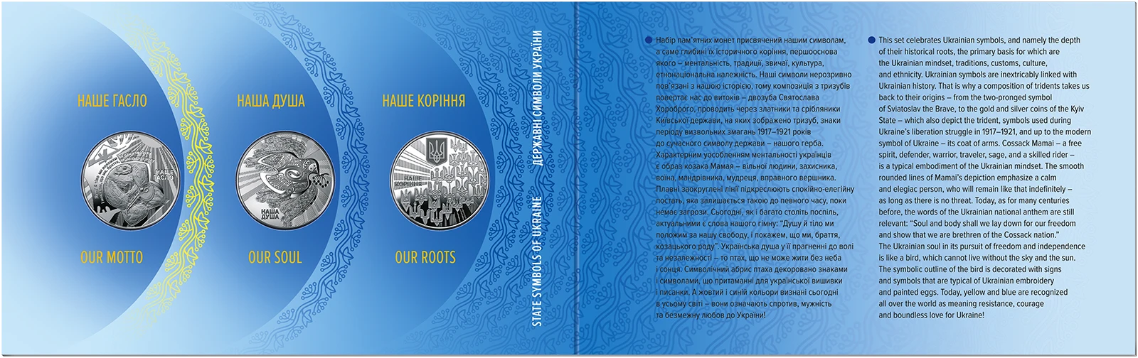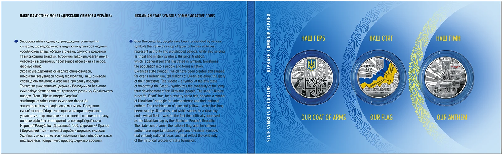 All coin sale ads on our websiteThe set of three commemorative coins ``State symbols of Ukraine'' is dedicated to the main attributes of the state, symbols of Ukraine, which embody the national idea and reflect the state's historical endurance. Our symbols inform millions of Ukrainians about the glory of their great-grandfathers. The trident as a sign of the Kyiv State of Volodymyr the Great symbolizes the continuity of the historical development of the Ukrainian people. The song "Ukraine is not dead yet" has become a powerful symbol of the struggle for independence and a national anthem in a century and a half. The combination of blue and yellow colors, which have long been used by Ukrainians for their own identity, are the colors of the clear sky and wheat field, officially approved even on the flag of the Ukrainian People's Republic. The set includes commemorative coins "Our coat of arms", "Our flag", "Our anthem".