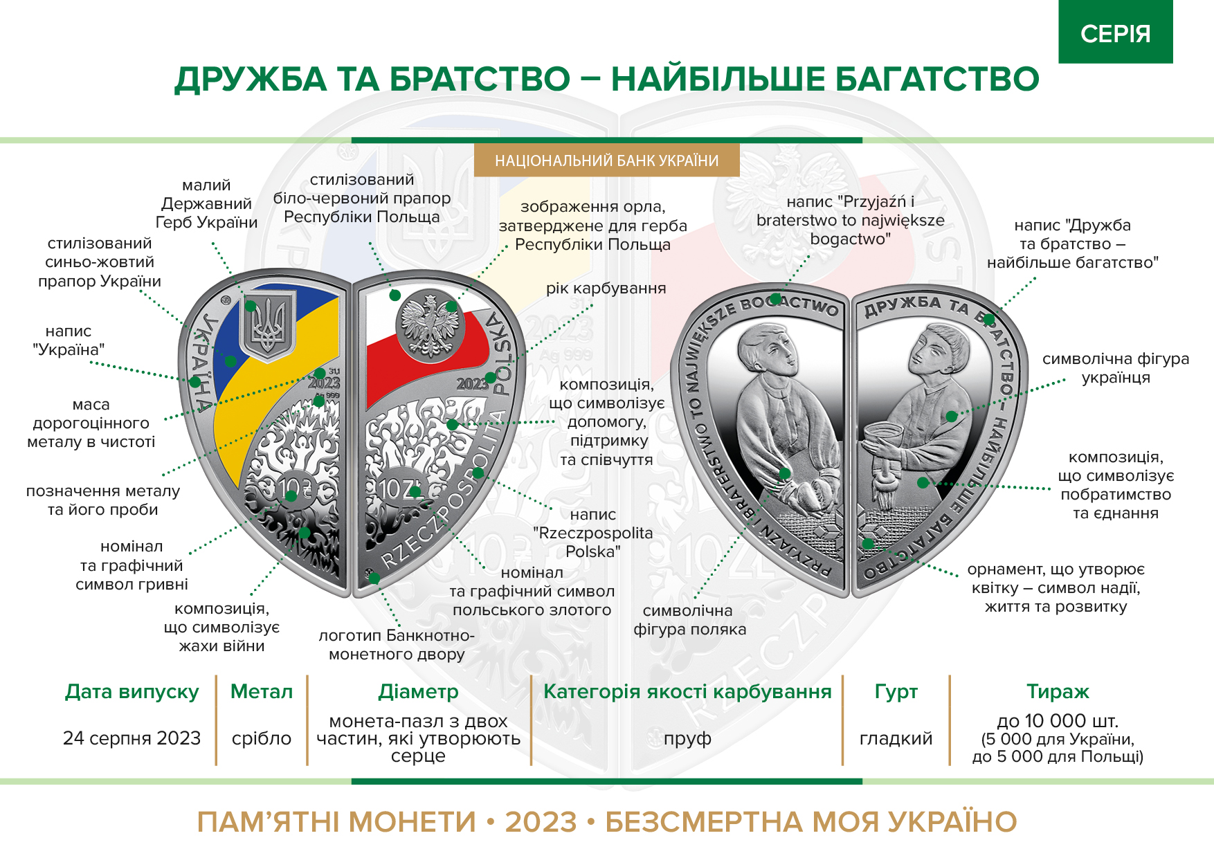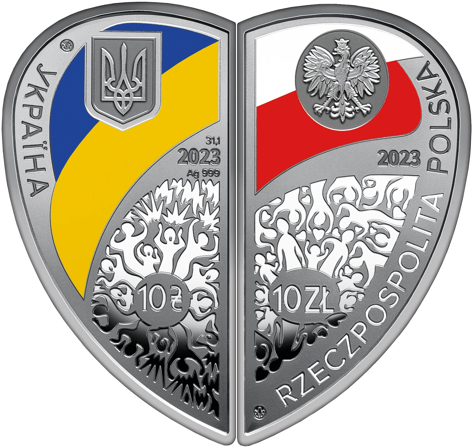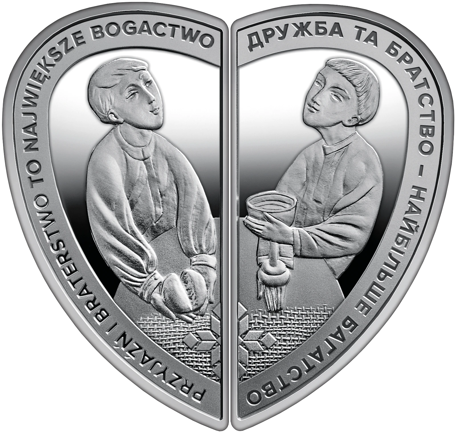 All coin sale ads on our websiteСпільний випуск набору є проявом солідарності народів Польщі та України в умовах російської агресії проти України. Польща всебічно допомагає та підтримує Україну, яка бореться за свободу та незалежність, захищаючи всю Європу. Українці вдячні польському народу за щиросердність, допомогу, підтримку та партнерство. Тираж набору – до 10 000 штук (у тому числі 5 000 штук для України, до 5 000 штук для Польщі). Монета Національного банку України є законним платіжним засобом в Україні. Монета Національного банку Польщі є законним платіжним засобом у Польщі. На реверсах монет зображено символічні постаті українця (на монеті номіналом 10 гривень) і поляка (на монеті номіналом 10 злотих), які сидять за одним столом, накритим скатертиною, і діляться хлібом та вином. Це символічна композиція, що притаманна традиційним уявленням і звичаям обох сусідніх слов’янських народів: розділити хліб – означає жити в добрі і злагоді, побрататися, допомогти у скруті. Розламати хліб – розділити долю, найвища ступінь прихильності і приязні. Сидіти за одним столом і пити вино з однієї чаші означає взаємну любов і повагу. Пиття зі спільної чаші символізує єднання, побратимство. Якщо дві монети скласти разом, орнамент у нижній частині утворює квітку – символ надії, життя та розвитку. На реверсі монет розміщено написи півколом: ДРУЖБА ТА БРАТСТВО – НАЙБІЛЬШЕ БАГАТСТВО (на монеті номіналом 10 гривень); PRZYJAZN I BRATERSTWO TO NAJWIEKSZE BOGACTWO (на монеті номіналом 10 злотих).
